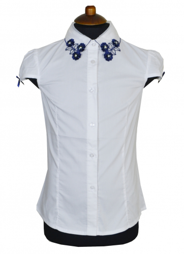 Блузка для девочки из хлопковой ткани. Блузка свободного кроя. Застежка на пуговицы.Спинка на кокетке от которой идут защипы. Спинка и рукав дополнены тесьмой. Брошь в комплекте.