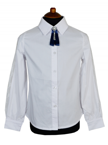 Модная блузка для девочки. Ткань высокого качества, плотная, приятная к телу. Застежка на пуговицы. Спущенное плечо. По спинке и рукавам добавлен волан с тесьмой, очень эффектно смотрится..Можно носить как с брюками на выпуск, так и под заправку. Брошь в комплекте.
