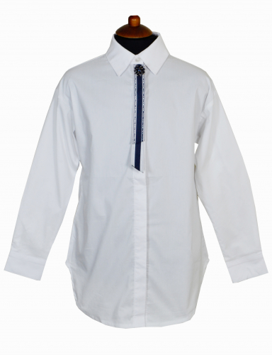 Модная блузка для девочки. Ткань высокого качества, плотная, приятная к телу. Застежка на пуговицы. Спущенное плечо. По спинке и рукавам добавлен волан с тесьмой, очень эффектно смотрится..Можно носить как с брюками на выпуск, так и под заправку. Брошь в комплекте.