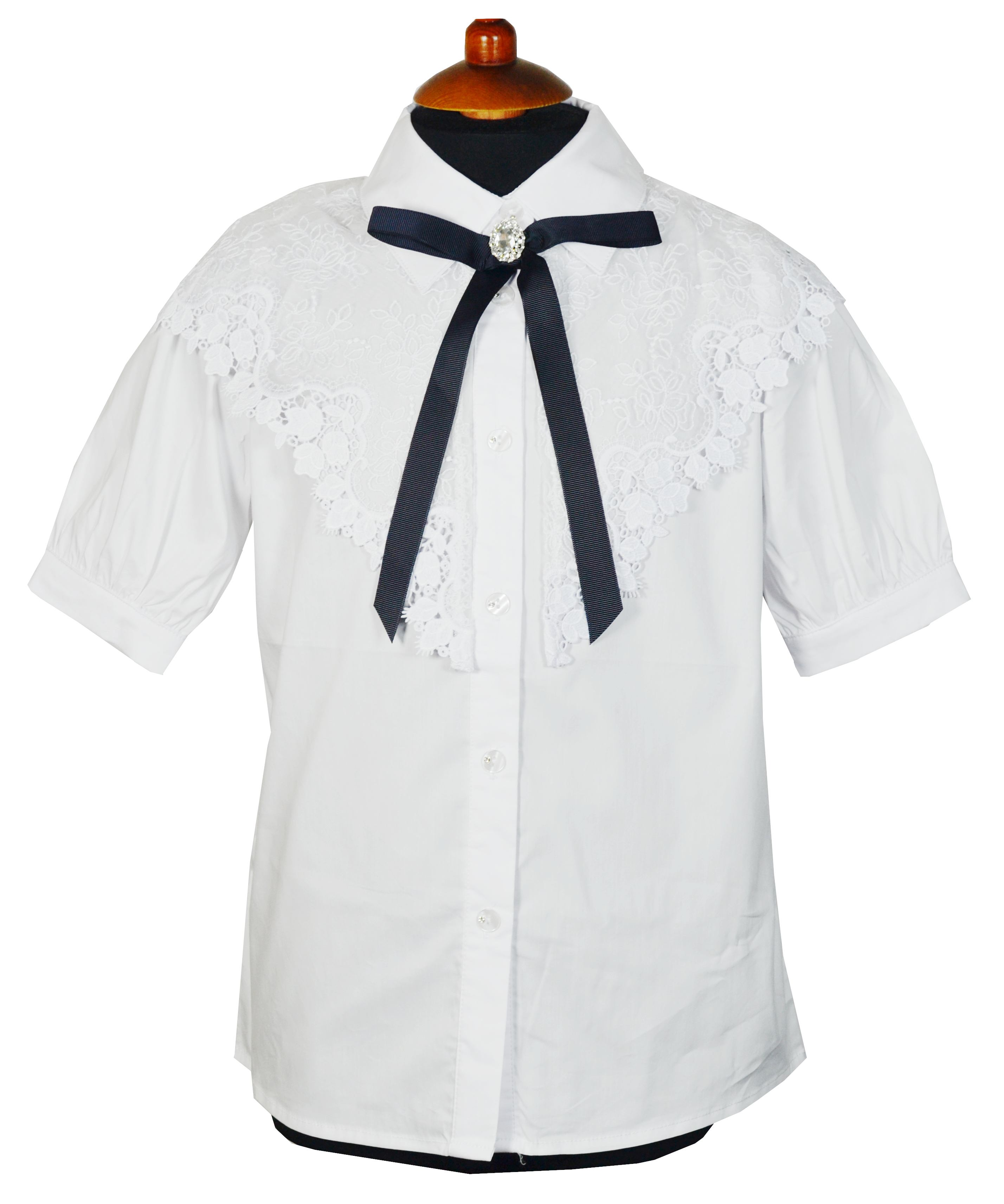 Блузка для девочки из хлопковой ткани с коротким рукавом. Ткань высокого качества, плотная, приятная к телу. Застежка на пуговицы. Дополнена кружевным воротником.  Брошь съемная, черного цвета входит в комплект.