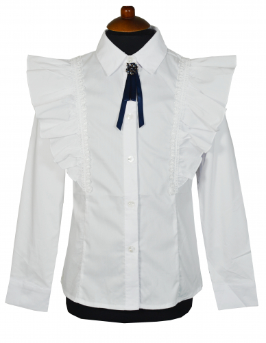 Блузка для девочки из хлопковой ткани.Застежка на пуговицы. Дополнена кружевом и съемной брошью.