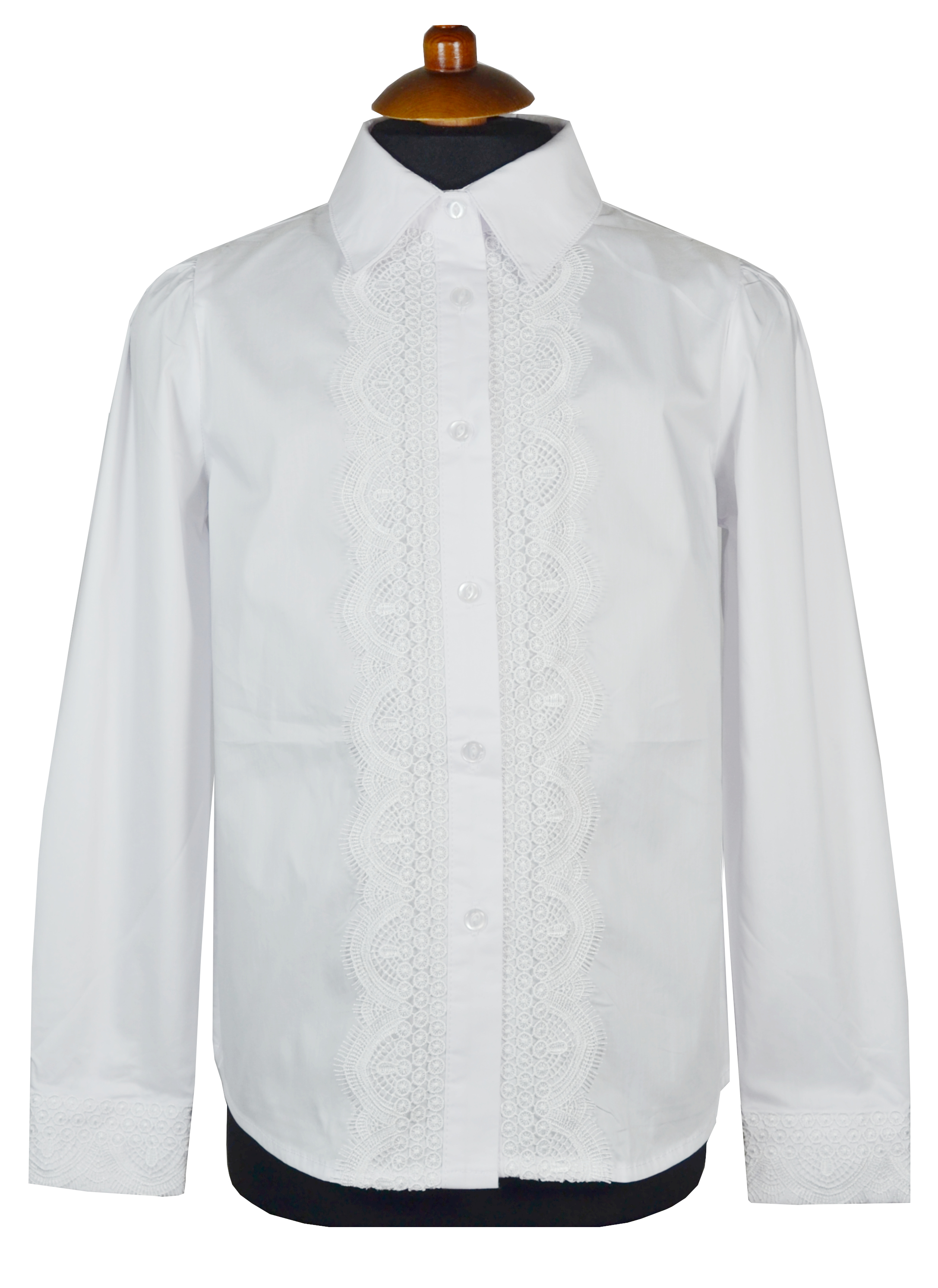 Блузка для девочки из хлопковой ткани. Базовая модель. Застежка  на пуговицы. Вторник рубашечного кроя. Дополнена кружевной широкой тесьмой по застежке и манжетам.