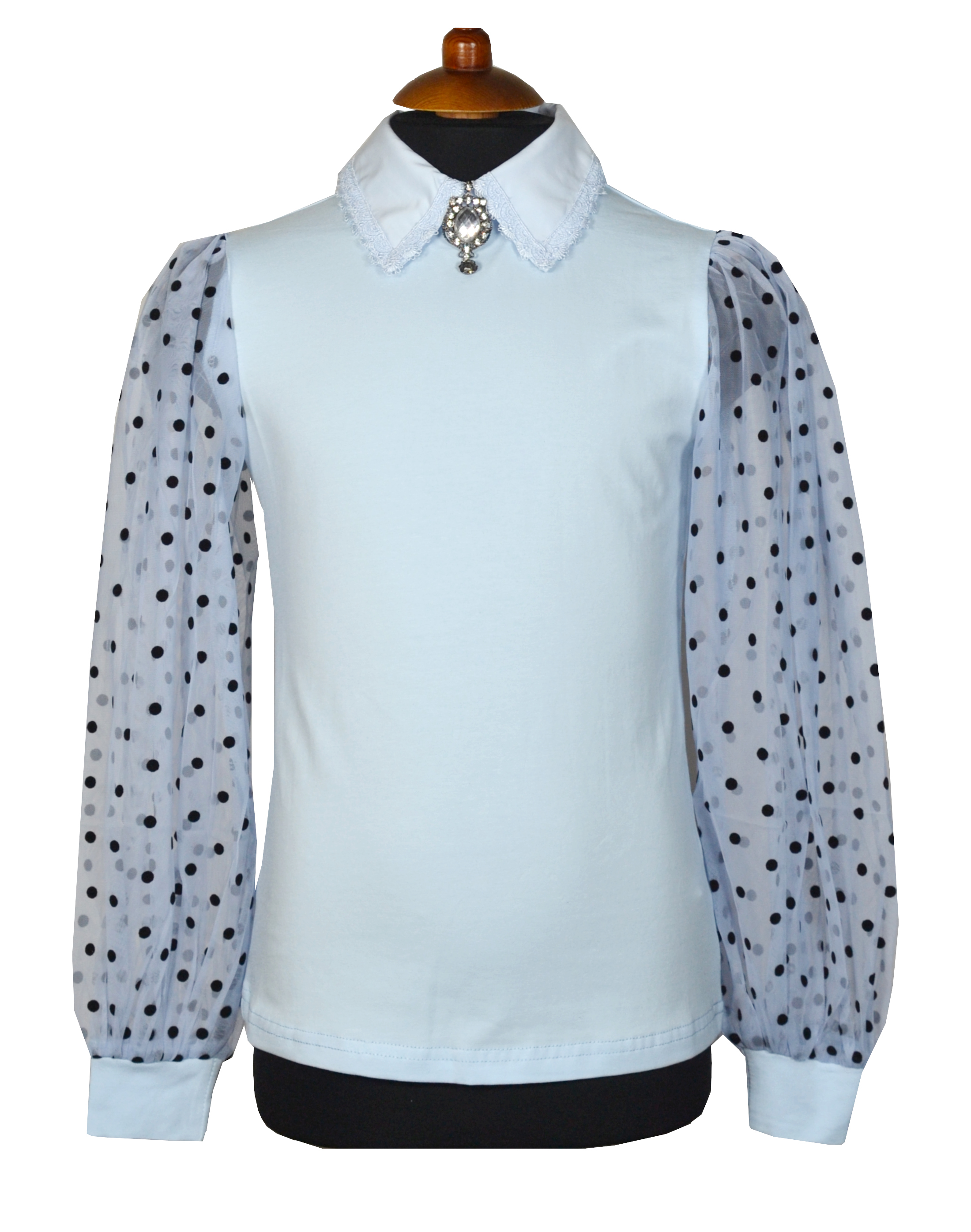 Блузка для девочки из трикотажной ткани. Застежка на пуговицу по спинке. Воротник  из блузочной ткани с кружевной отделкой. Рукава из сетчатого трикотажа. Брошь в комплекте.
