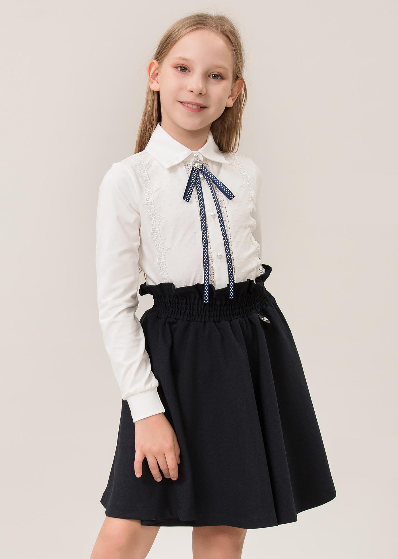 Блузка для девочки из трикотажной ткани. Застежка на пуговицы. Воротник и зона застежки из блузочкой ткани.  Рукав и манжет выполнен из трикотажной ткани. Полочка дополнена кружевным полотном. Бантик-брошь в комплекте. Очень удобная и нарядная.