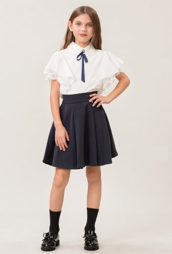 Блузка для девочек из трикотажной ткани с добавлением эластана. Рукав выполнен в два слоя из кружевного полотна. Рукав хорошо держит форму. Застежка-капелька на пуговицу по спинке.  Воротник с закругленными концами из хлопковой, блузочной ткани. Бантик на резинке в комплекте. Качество изделия очень высокое.