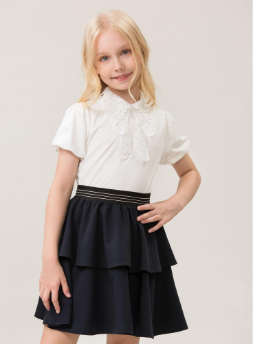 Блузка для девочек из трикотажной ткани с добавлением эластана. Воротник из блузочкой ткани. Застежка по спинке на пуговицу. Рукав выполнен в два слоя из сетчатого трикотажного полотна. Брошь в комплекте. Пояс в комплекте, но можно носить без него.