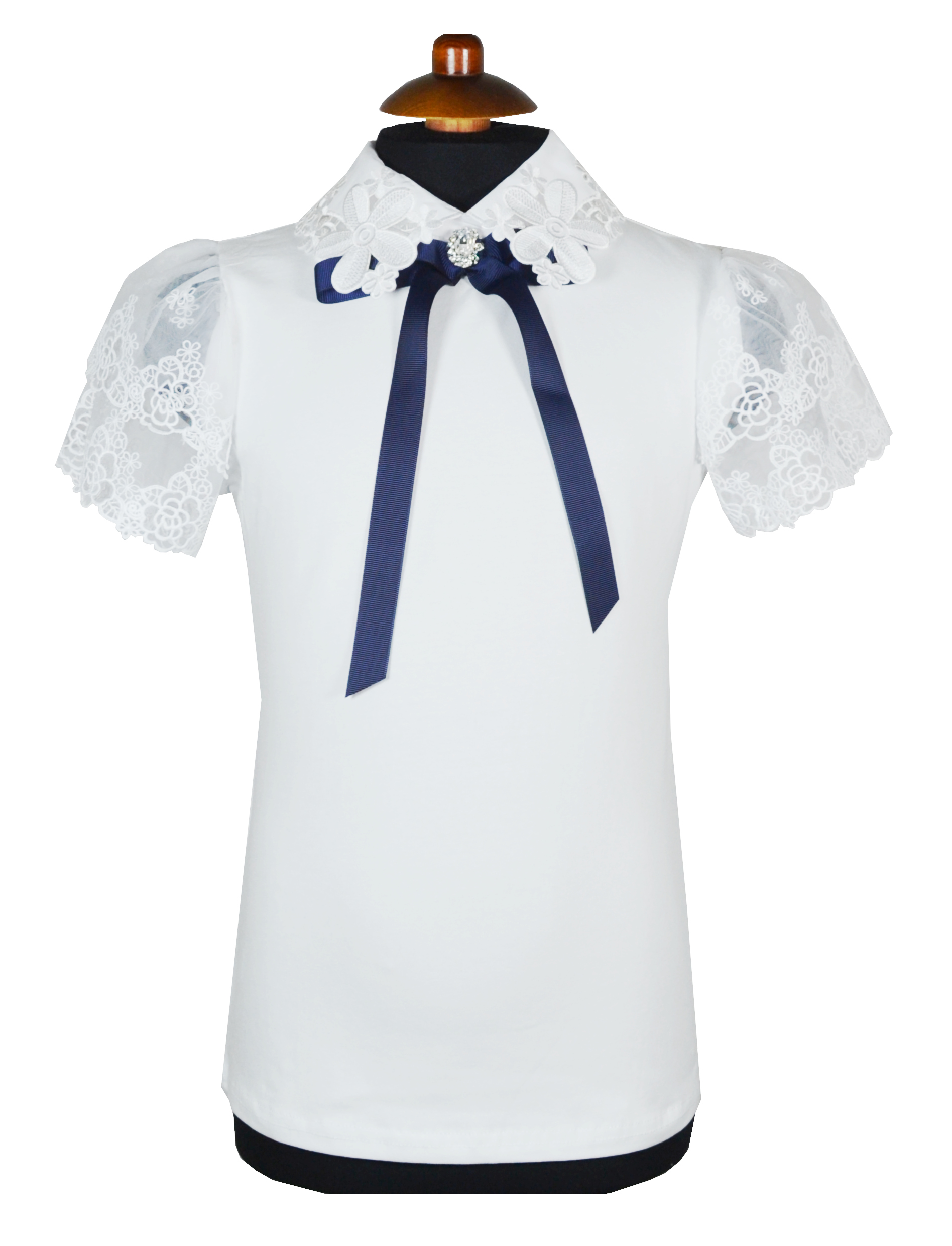 Блузка для девочек из трикотажной ткани с добавлением эластана. Рукав-крыло в два слоя из сетчатого трикотажа с вышивкой. Рукав хорошо держит форму. Застежка-капелька на пуговицу по спинке.  Воротник из шифона с вышивкой. Галстук в комплекте. Качество изделия очень высокое.