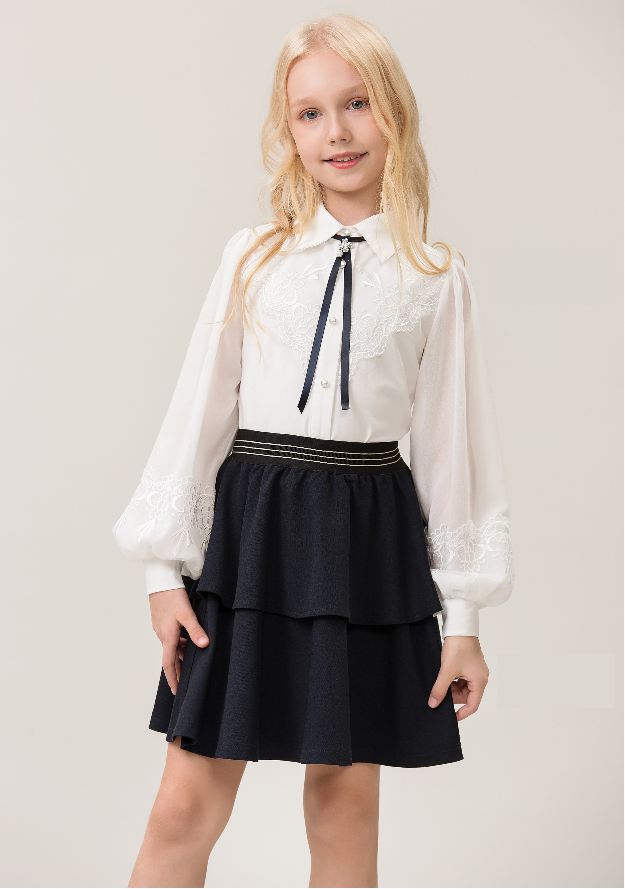Блузка для девочки из трикотажной ткани. Застежка на пуговицы. Воротник и зона застежки из блузочкой ткани.  Рукав выполнен их шифона с вышивкой, манжет из трикотажа. Полочка дополнена кружевным полотном. Бантик-брошь в комплекте. Очень удобная и нарядная.