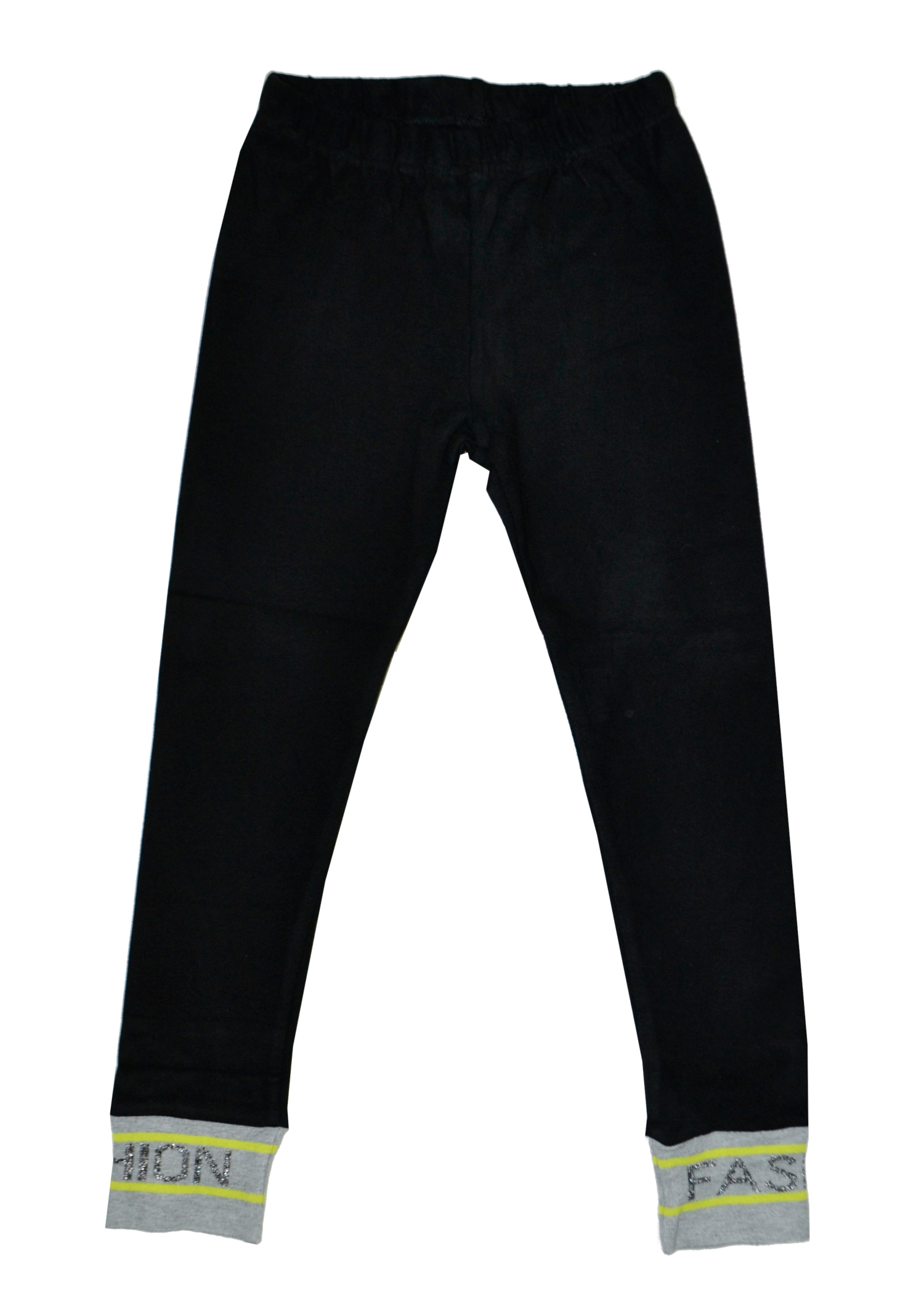 Лосины из плотной трикотажной ткани с добавлением эластана. Пояс на резинке. По низу трикотажный манжет с цветными надписями с рюлексом.
