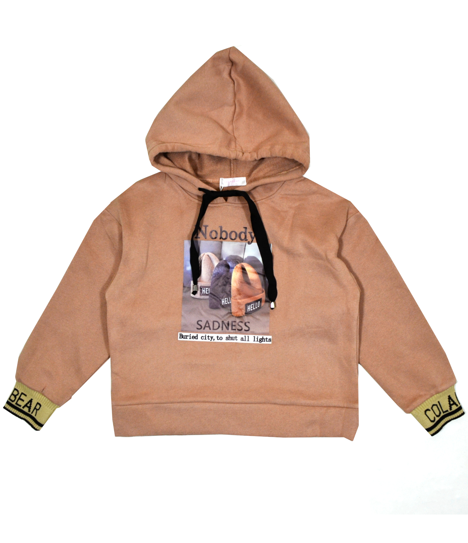 Теплый джемпер для девочки. Ткань плотная с начесом. Спущенное плечо.  Спинка без особенностей.  Капюшон дополнен шнурком. Дополнен джемпер принтом.