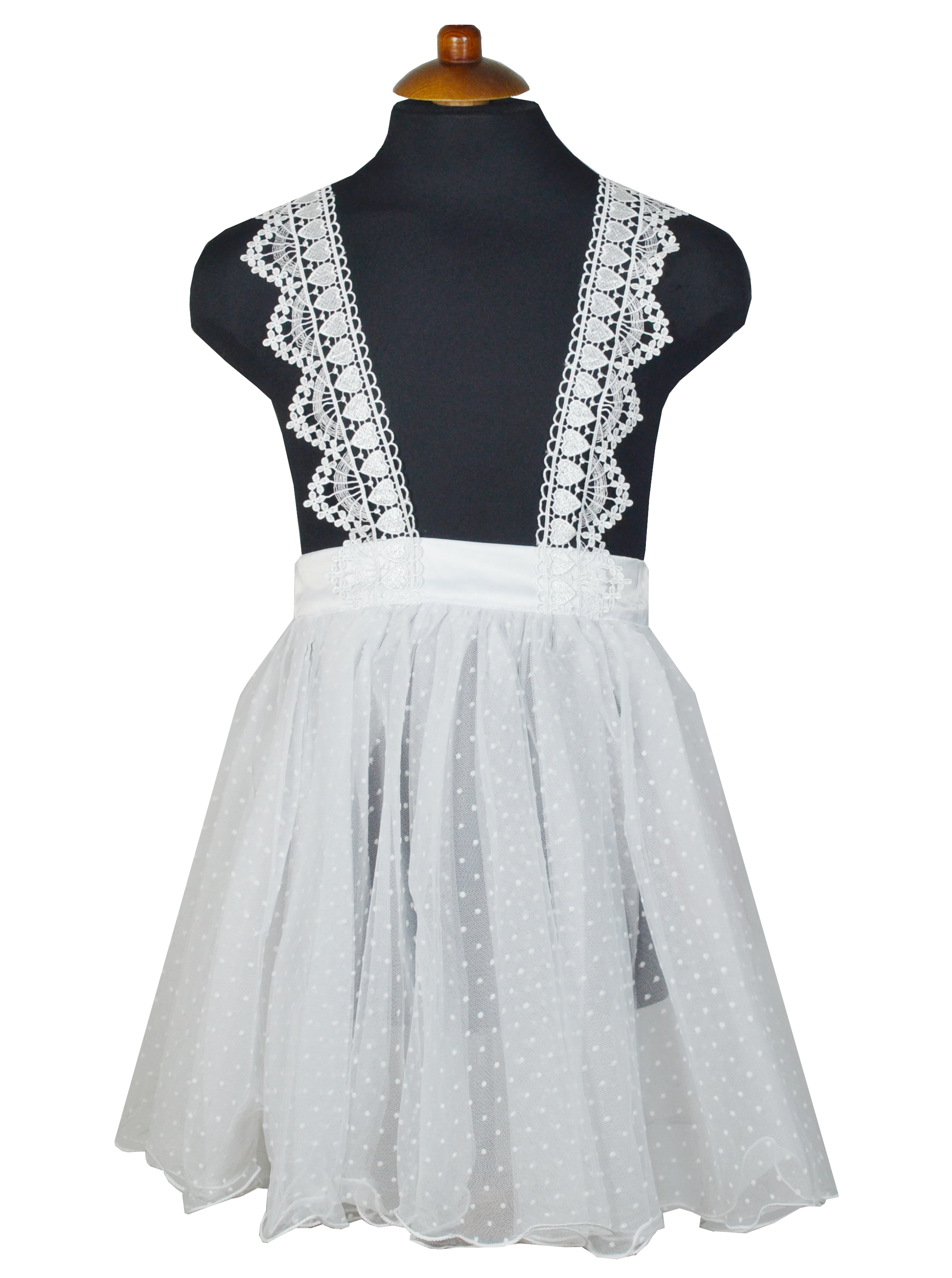 Фартук школьный для платья. Выполнен из сетчатого трикотажа. Лямки - широкое кружево. По спинке лямки перекрещиваются и завязываются по талии на бант.