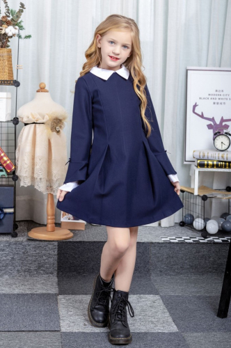 Трикотажное платье для девочки. Ткань  плотная и хорошо держит форму. Длина чуть выше колена. Воротник съемный. По низу рукава воланы в два слоя, один из блузочной ткани. Застежка по спинке.