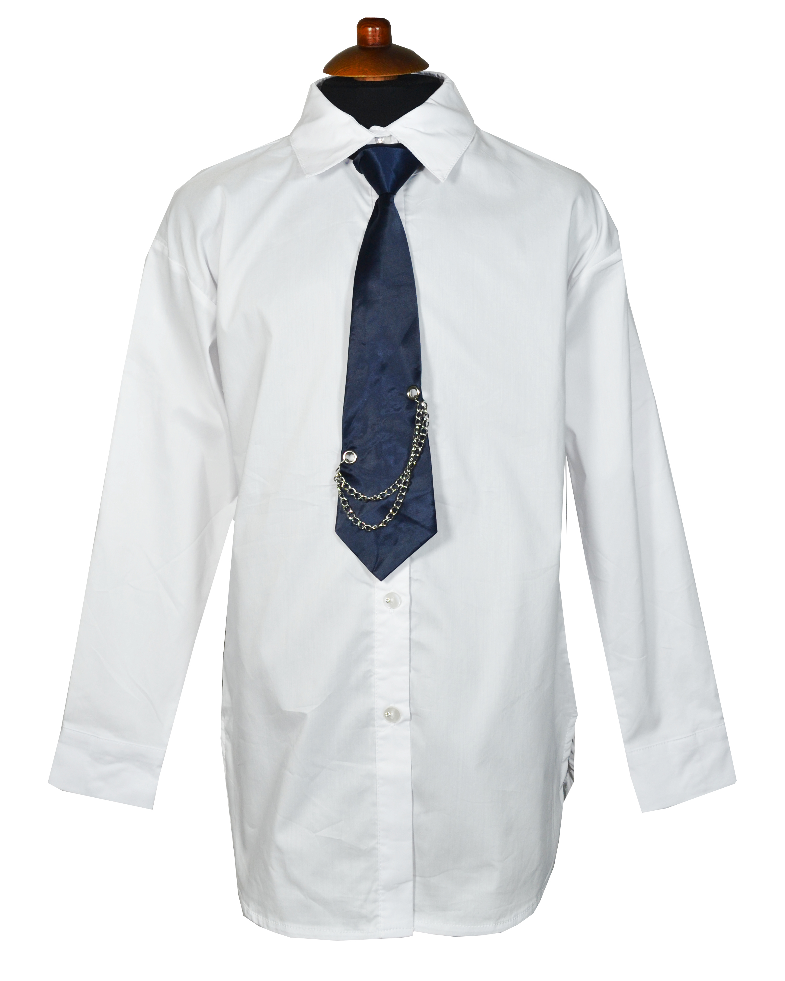 Модная рубашка для девочки. Ткань высокого качества, плотная, приятная к телу. Застежка на пуговицы.  Украшение блузки синий галстук с цепочками. Можно носить как с брюками на выпуск, так и под заправку.