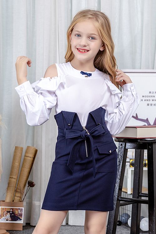 Трикотажная юбка для девочки с завышенной талией. Ткань  плотная ,хорошо держит форму. Длина чуть выше колена. Застежка на замок спереди. Пояс из основной ткани входит в комплект. Накладной карман.