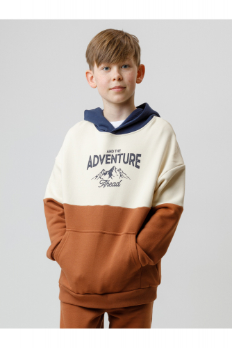 Худи с капюшоном для мальчика из тёплого футера с начёсом. Пояс и манжеты выполнены из мягкого эластичного трикотажа. Спереди удобный и вместительный карман-кенгуру. Худи сохраняет форму и стойкий цвет после многочисленных стирок и идеально подходит на каждый день. Оригинальный принт выполнен из стойких текстильных гипоаллергенных красителей. Все трикотажные полотна производятся в соответствии с нормами швейцарского сертификата ЭкоТекс.