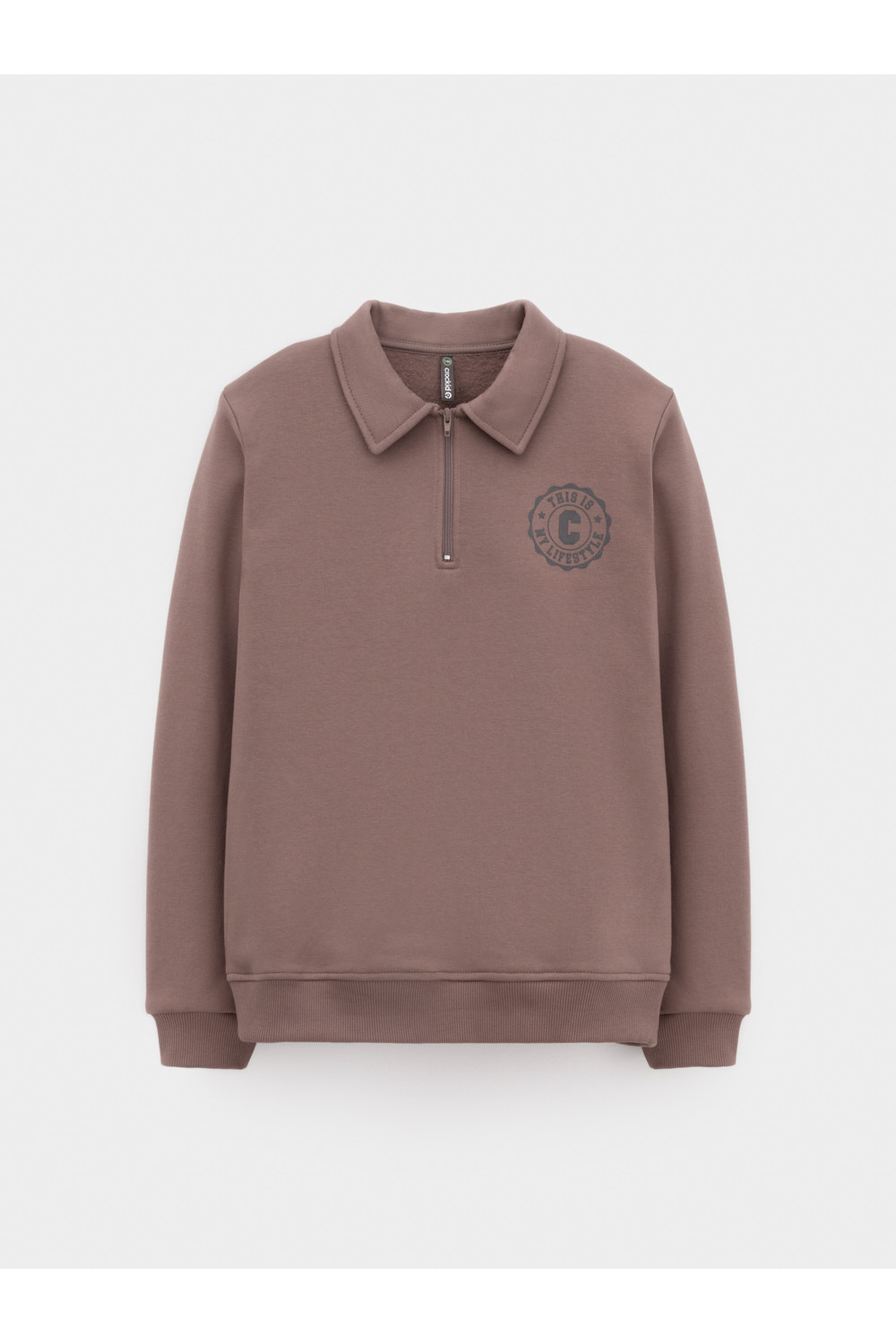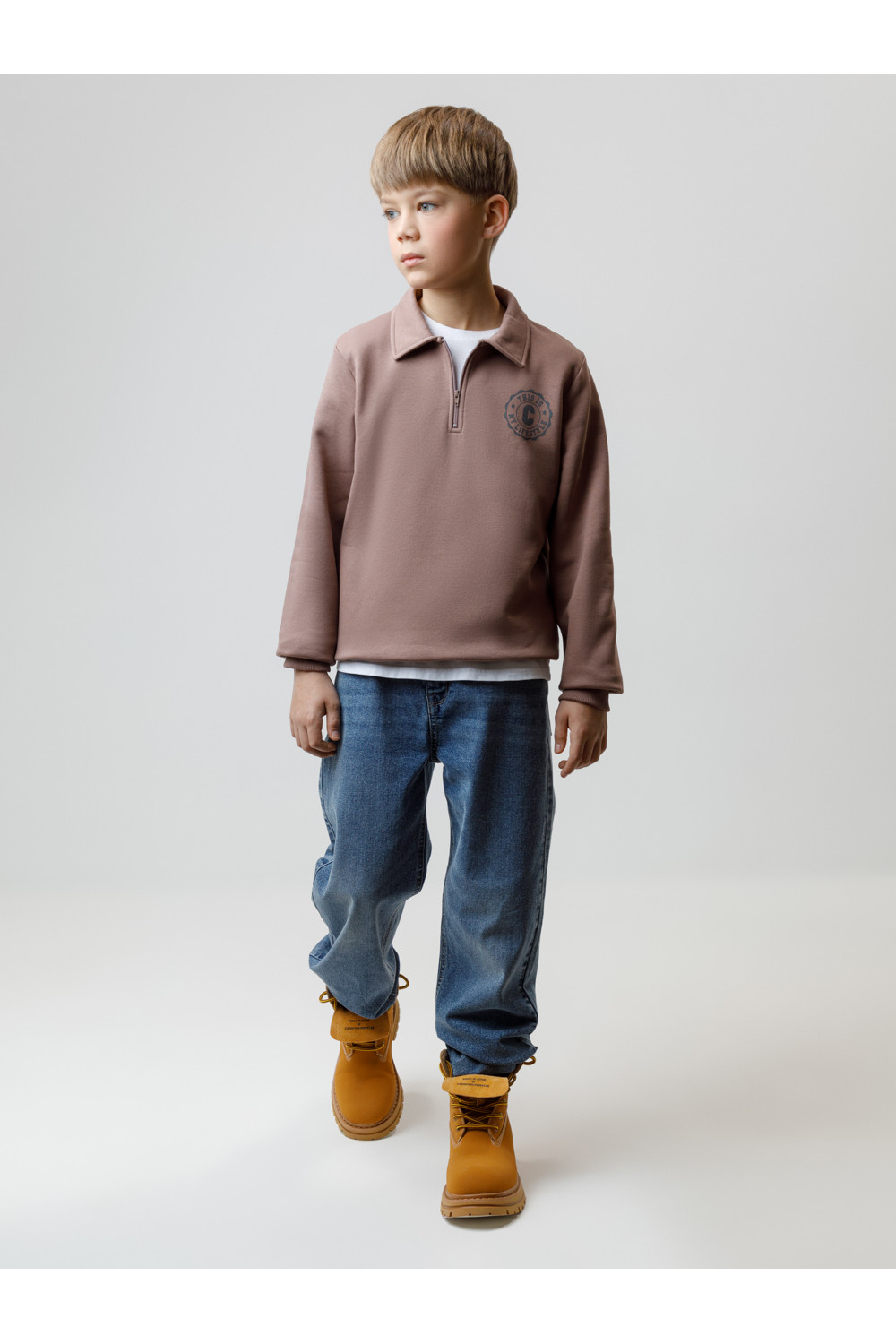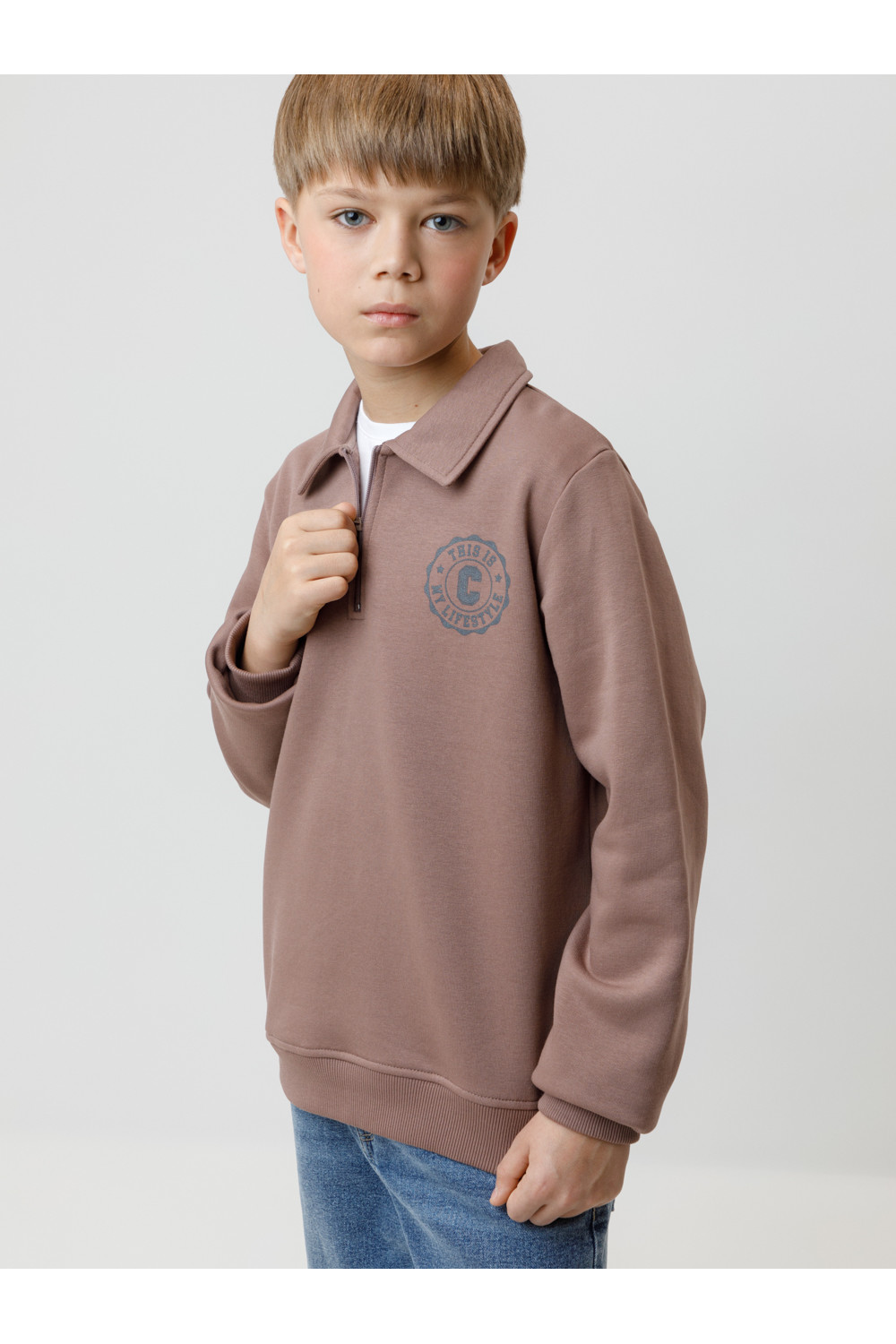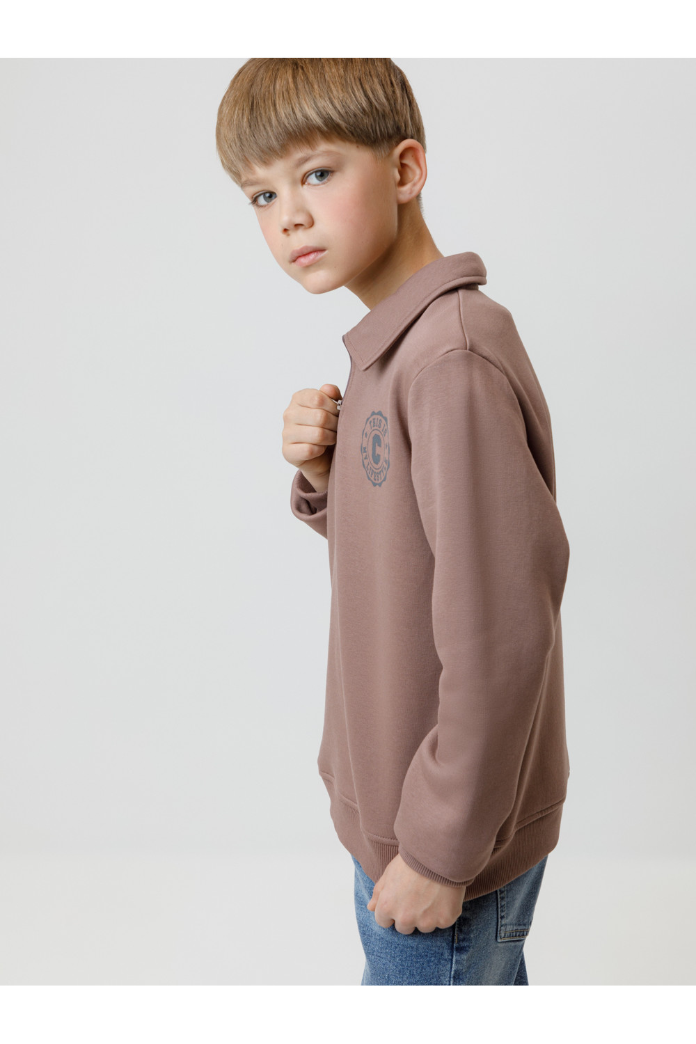Свитшот с воротником для мальчика. Изготовлен из высококачественного петельчатого футера. В составе 80% натурального хлопка и 20% полиэстера, при этом полиэстер ввязан внутрь по особой технологии и не соприкасается с кожей. Манжеты и пояс выполнены из эластичного полотна. На груди короткая застёжка на молнию. Оригинальный принт выполнен из стойких текстильных гипоаллергенных красителей. Изделие сохраняет цвет и форму после многократных стирок.