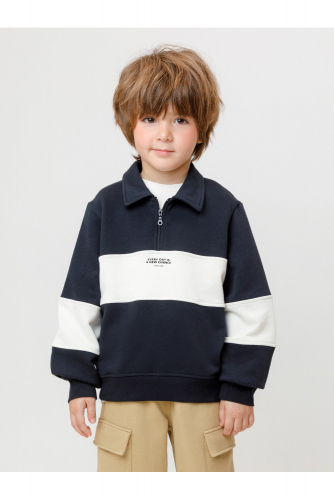 Свитшот с воротником для мальчика. Изготовлен из высококачественного петельчатого футера трёхнитки. Манжеты и пояс выполнены из эластичного полотна. На груди короткая застёжка на молнию. Оригинальный принт выполнен из стойких текстильных гипоаллергенных красителей. Изделие сохраняет цвет и форму после многократных стирок.