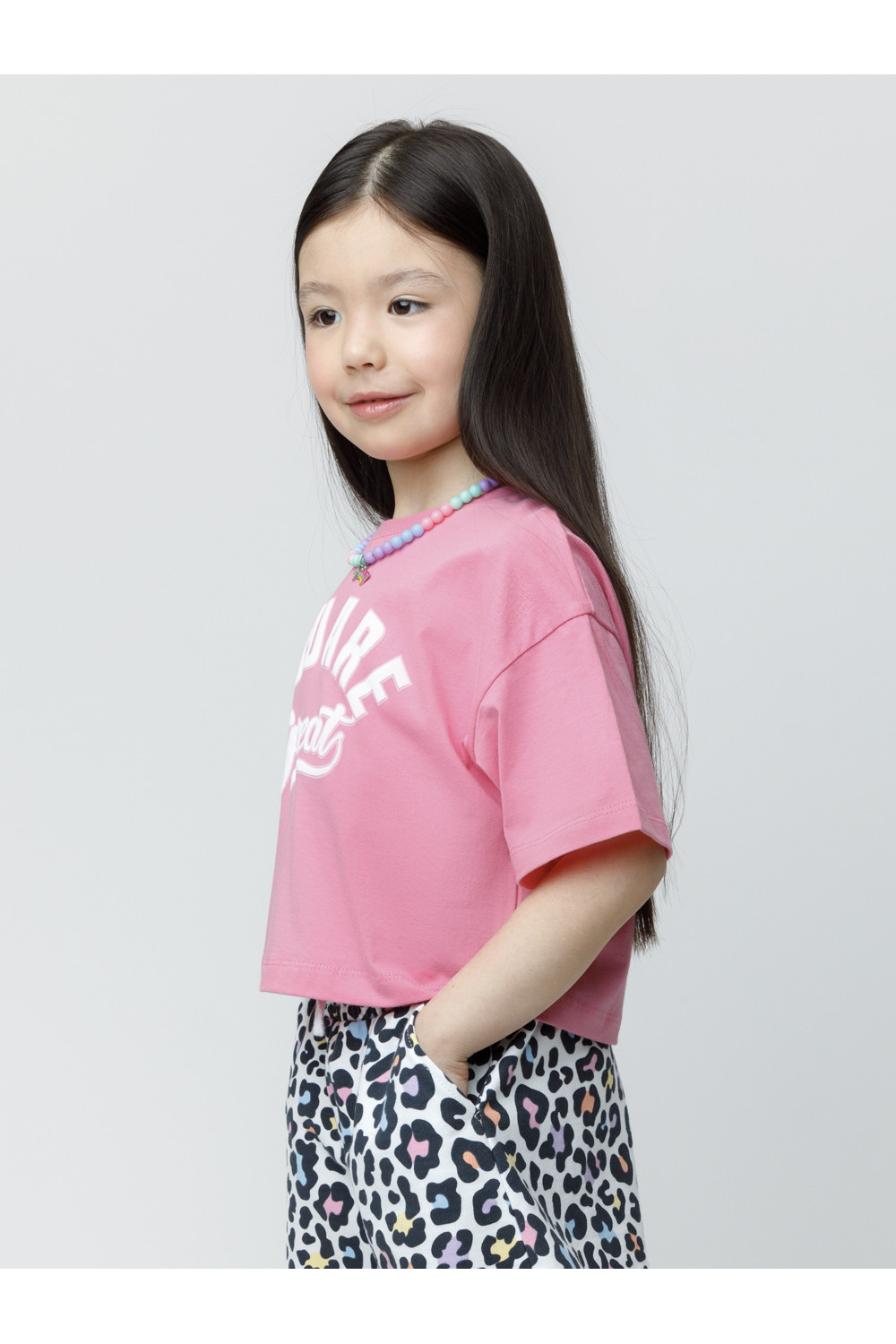 Футболка для девочки из высококачественного трикотажного полотна. Оригинальный принт выполнен из стойких текстильных гипоаллергенных красителей. Изделие сохраняет цвет и форму после многократных стирок. Все трикотажные полотна производятся в соответствии с нормами швейцарского сертификата ЭкоТекс.