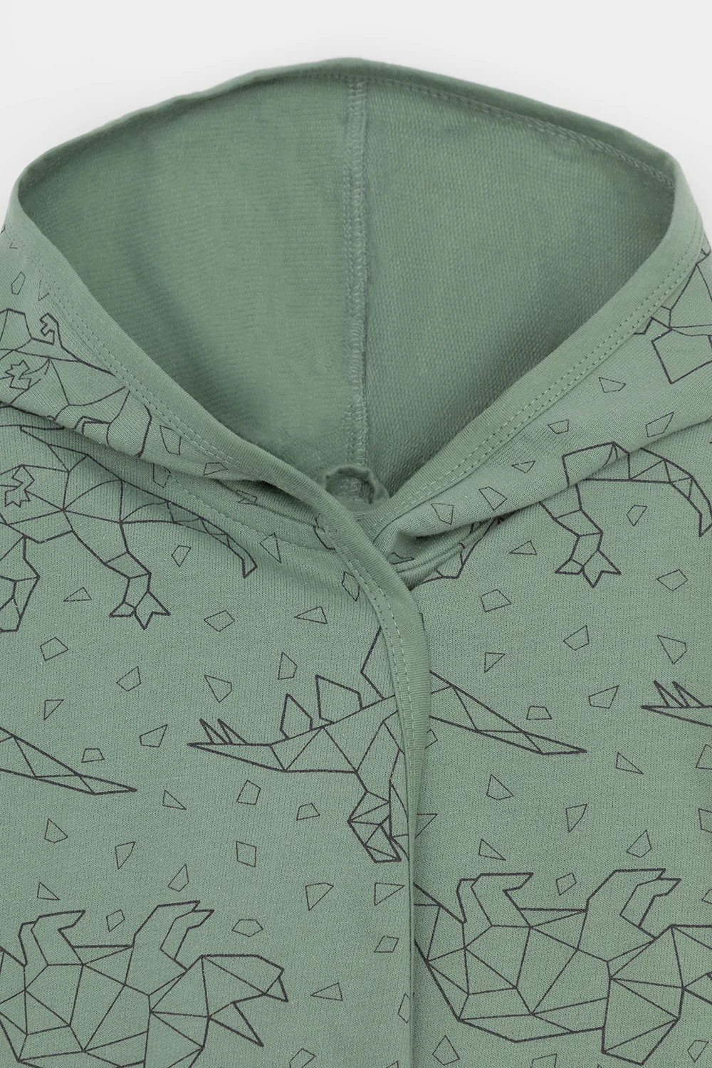 Халат с тонким капюшоном и поясом из набивного хлопкового трикотажа футер петля. Края обработаны мягким кантом. Накладной карман уходит в шов. Пояс продет в шлевки. Длинные рукава обработаны плоскими швами.