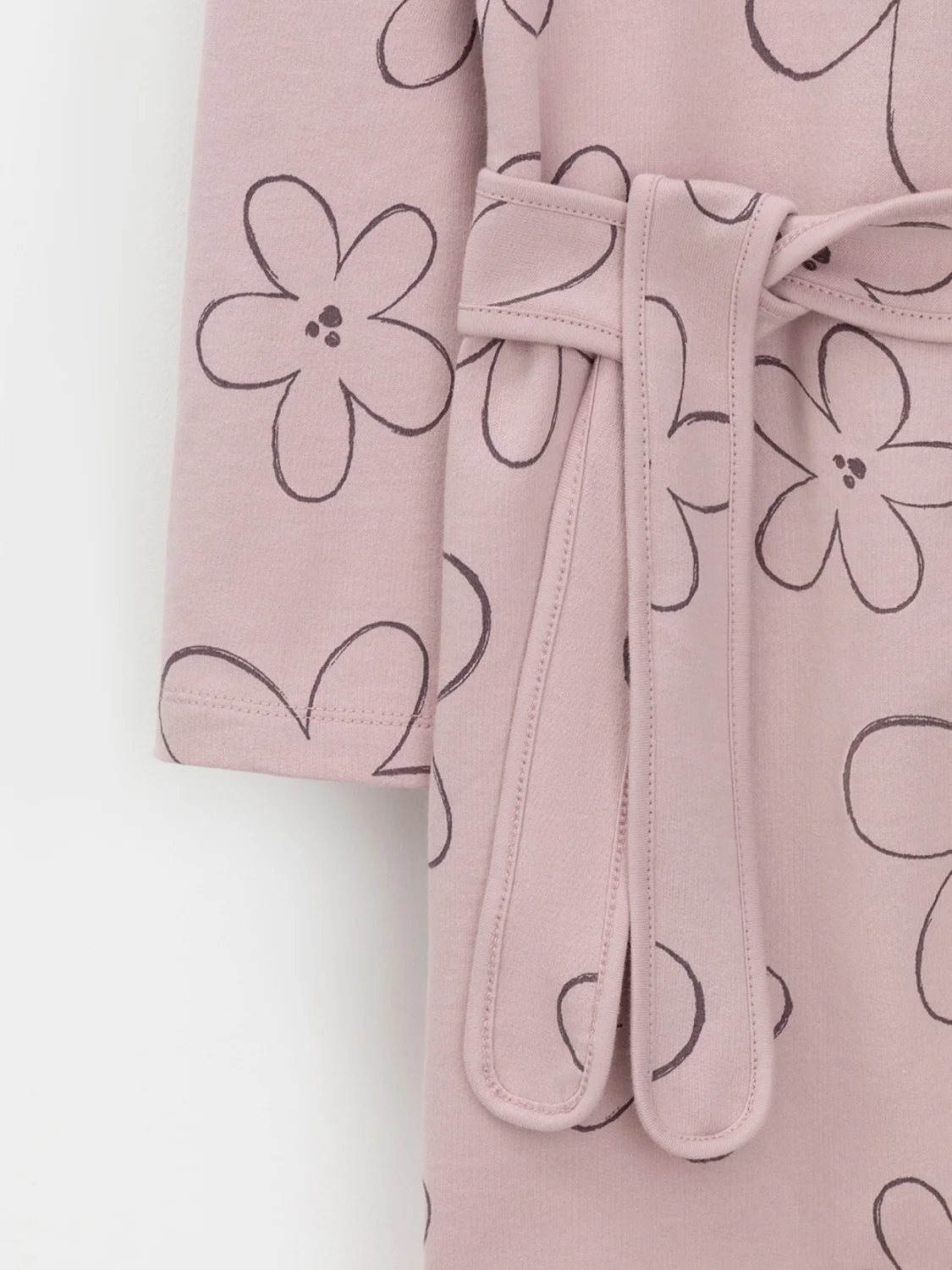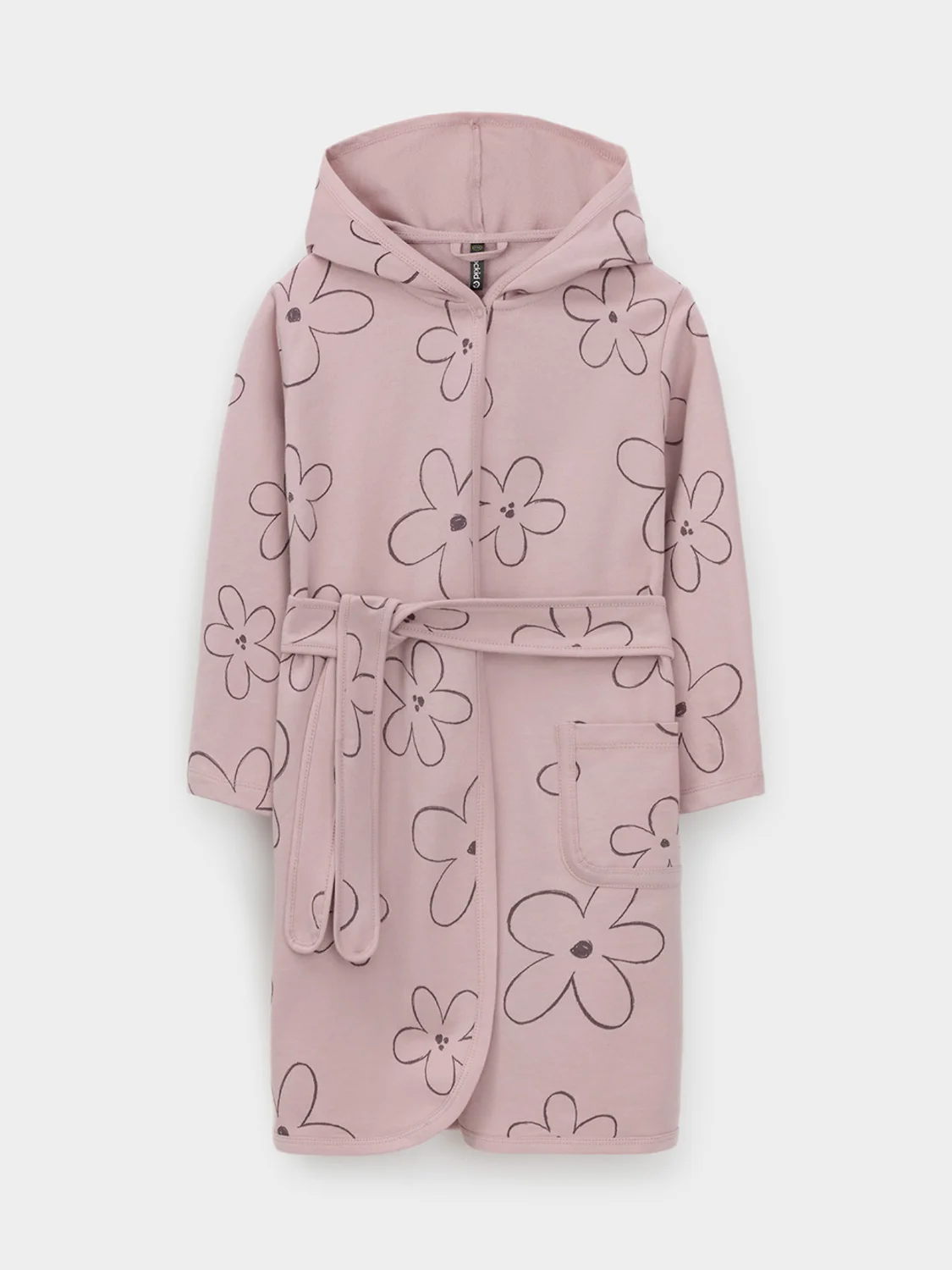 Халат с тонким капюшоном и поясом из набивного хлопкового трикотажа футер петля. Края обработаны мягким кантом. Накладной карман уходит в шов. Пояс продет в шлевки. Длинные рукава обработаны плоскими швами.