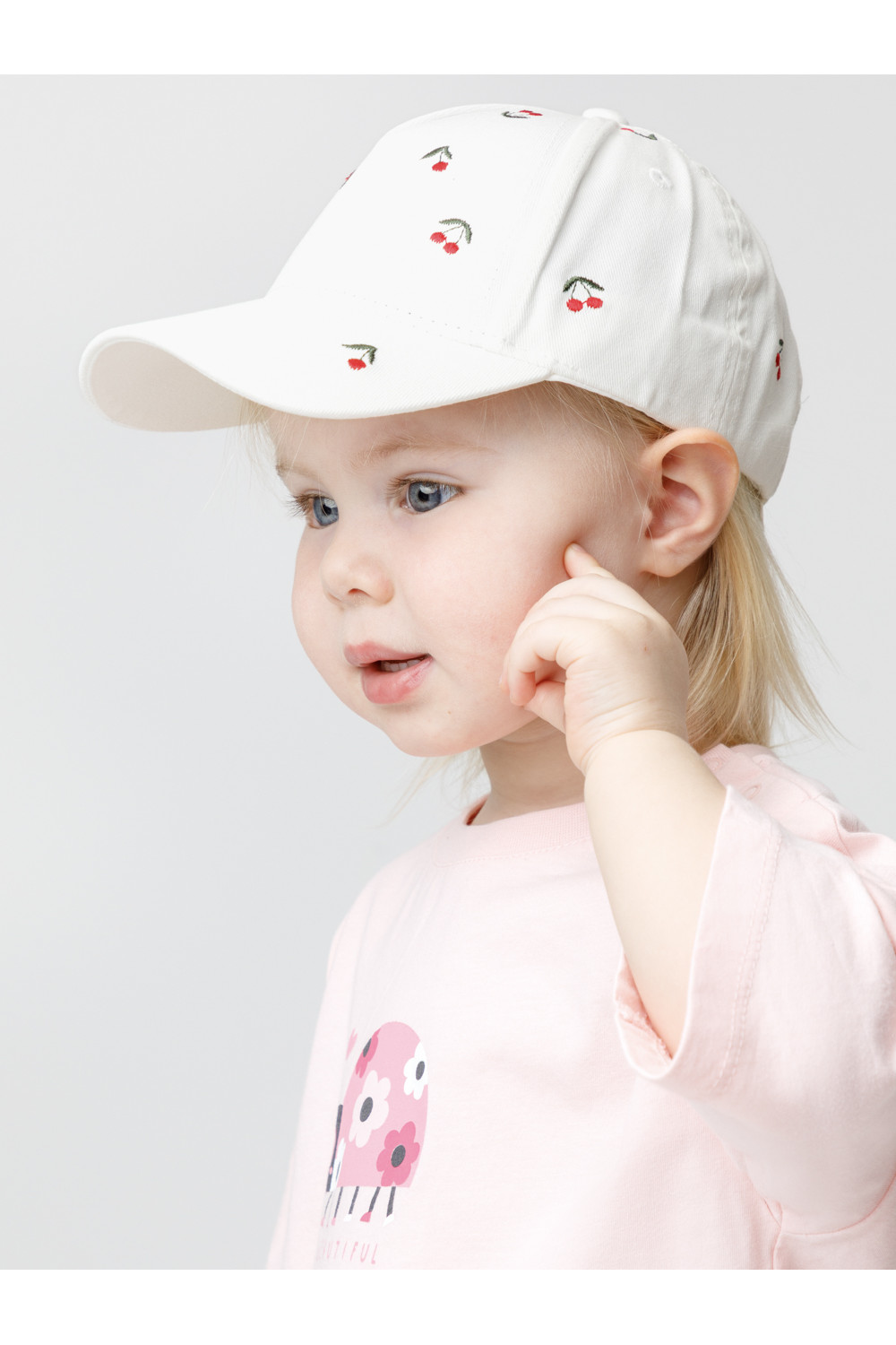 Кепка для девочки из натурального хлопка. Украшена вышивкой. Регулируется по ширине головы и фиксируется на затылке с помощью металлического зажима.