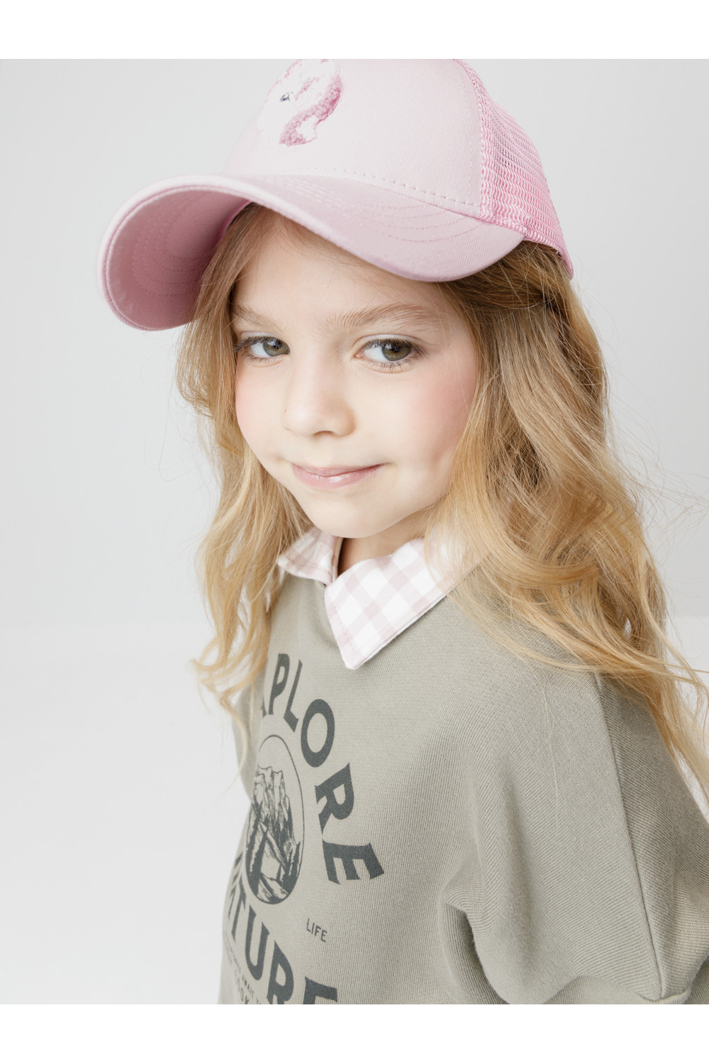 Кепка для девочки из текстиля и сетки. Спереди украшена оригинальной нашивкой. Регулируется по ширине головы и фиксируется на затылке с помощью пластиковой застёжки.