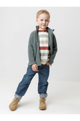 Флисовая куртка для мальчика. У изделия высокий воротник и застёжка на молнию с мягкой защитой шеи и подбородка. По бокам два кармана. Куртка сохраняет цвет и форму после многократных стирок.