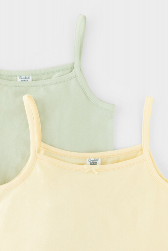 Трикотажные майки в комплекте 2 шт на тонких бретелях из однотонной рибаны, горловина и проймы обработаны кантом, по горловине полочки мережка и атласный бантик. Сохраняют цвет и форму после многократных стирок. Все трикотажные полотна производятся в соответсвии с нормами Швейцарского сертификата ЭкоТекс.