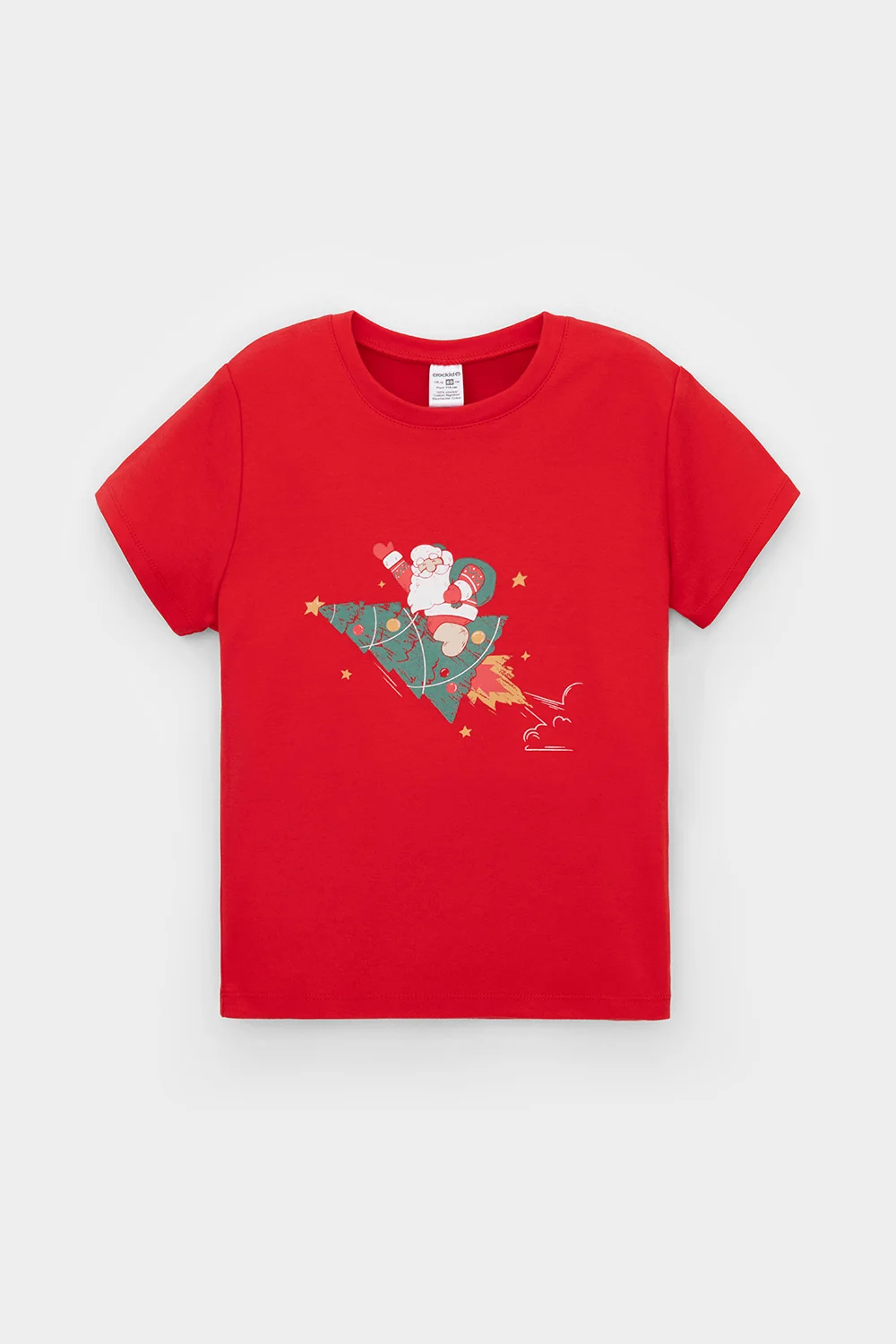 Пижама из хлопкового трикотажа интерлок. Однотонная футболка с короткими рукавами. Спереди принт. Штаны с набивным рисунком. Эластичные манжеты, цельнокроеный пояс, внутри плоская резинка.