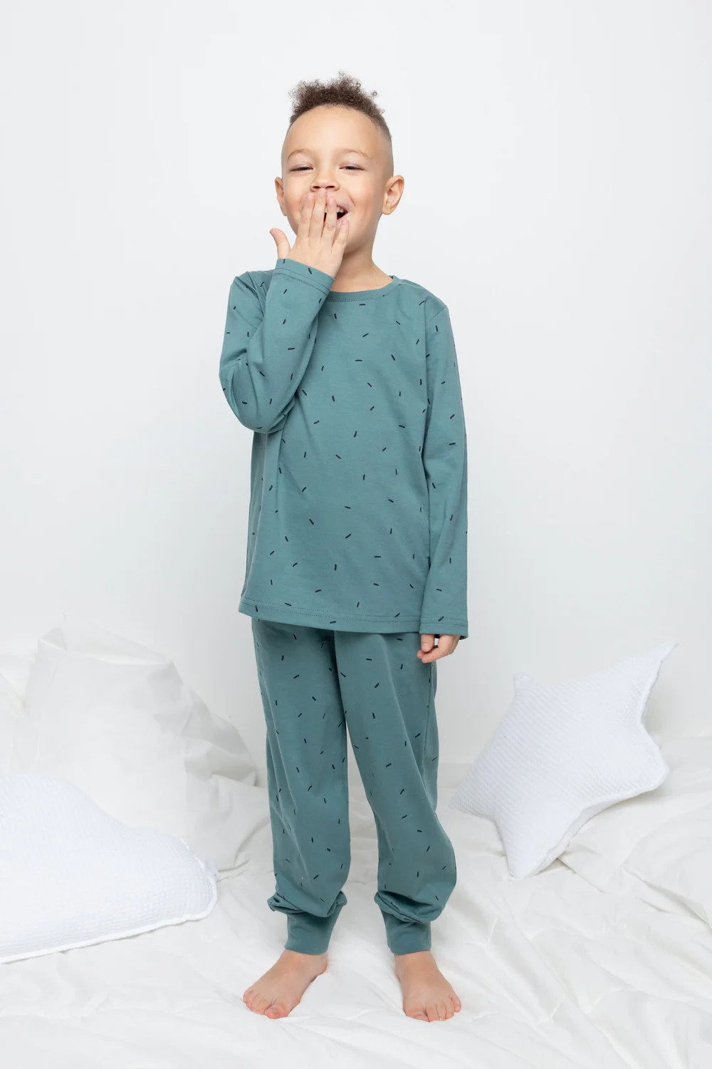 Трикотажная пижама из натурального хлопка. Джемпер с длинными рукавами с эластичными манжетами. У брюк эластичный пояс на резинке. Оригинальная набивка и принт выполнены из стойких, гипоаллергенных текстильных красителей. Пижама сохраняет цвет и форму после многократных стирок. Все трикотажные полотна производятся в соответствии с нормами Швейцарского сертификата ЭкоТекс.