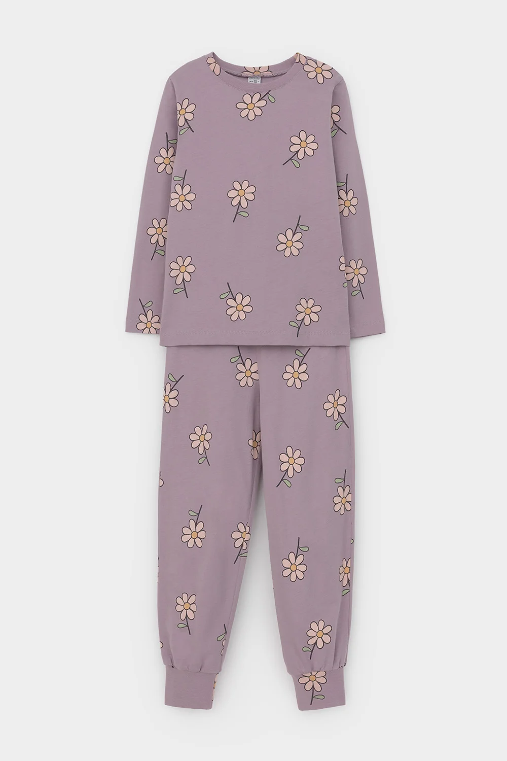 Пижама для девочки из натурального хлопка. Джемпер с длинными втачными рукавами и брюки с эластичной резинкой в поясе. Мягкие манжеты по низу брюк сделаны из материала в рубчик. Оригинальная набивка выполнена из стойких текстильных гипоаллергенных красителей. Изделие сохраняет цвет и форму после многократных стирок. Все трикотажные полотна производятся в соответствии с нормами швейцарского сертификата ЭкоТекс.
