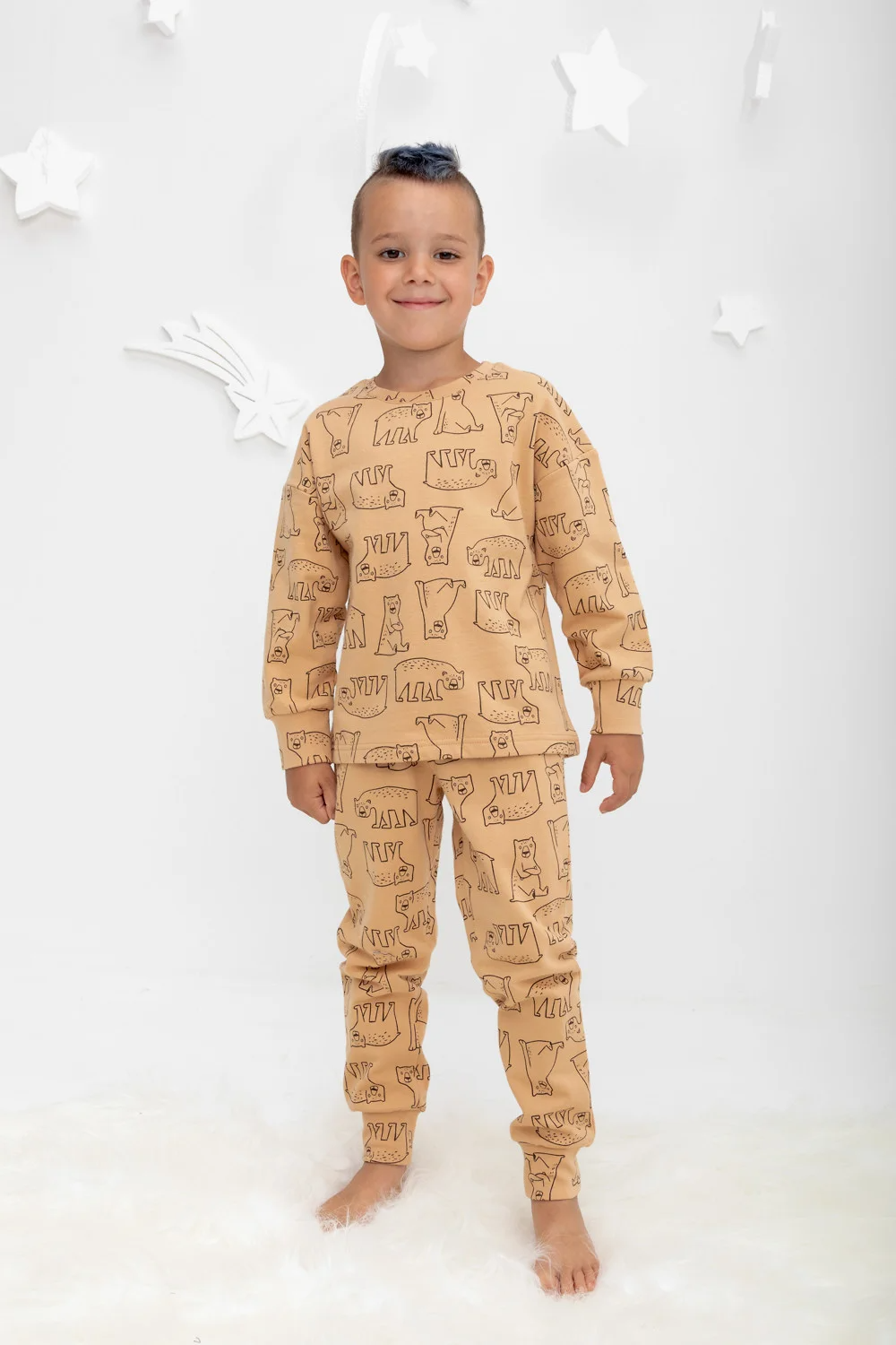 Трикотажный пижамный комплект из футера с начёсом, произведённого из натурального хлопка. У джемпера длинные рукава со спущенными плечами и эластичная мягкая горловина и манжеты. Брюки с удобным поясом на резинке, внизу манжеты. Оригинальная набивка выполнена из стойких, гипоаллергенных текстильных красителей. Все трикотажные полотна производятся в соответствии с нормами Швейцарского сертификата ЭкоТекс.