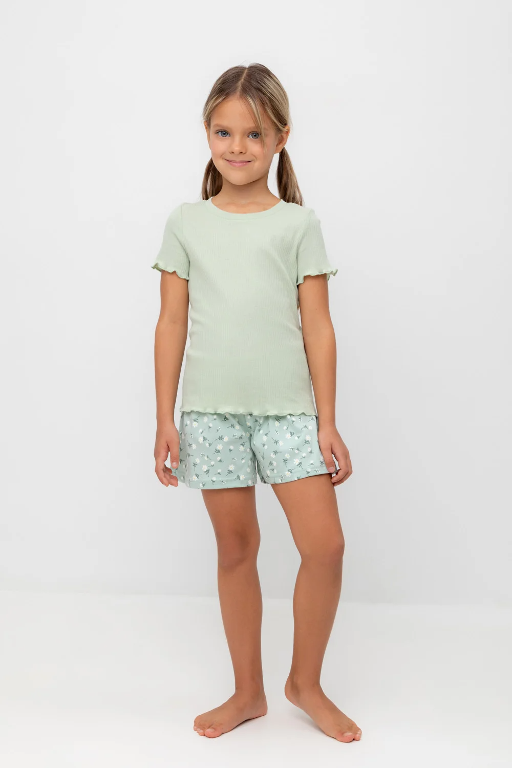 Трикотажная пижама из натурального хлопка. У футболки рукава и низ изделия обработаны микрооверлоком. У шорт в комплекте мягкий, эластичный пояс на резинке. Оригинальная набивка выполнена из стойких, гипоаллергенных текстильных красителей. Комплект сохраняет цвет и форму после многократных стирок. Все трикотажные полотна производятся в соответсвии с нормами Швейцарского сертификата ЭкоТекс.