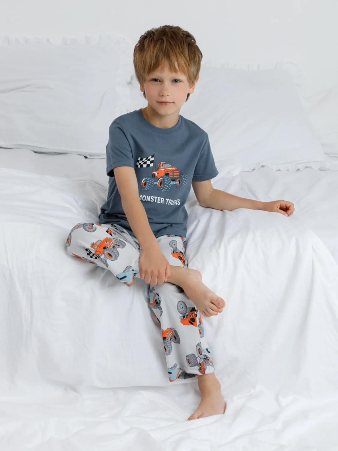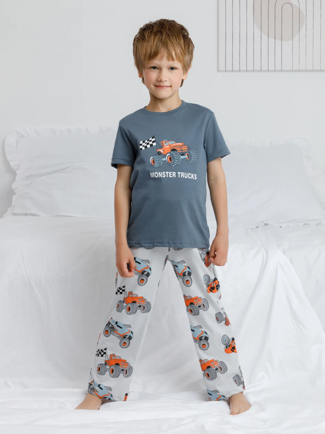 Трикотажная пижама из натурального хлопка. Футболка с короткими втачными рукавами и прямые брюки с эластичной резинкой в поясе. Оригинальные набивка и принт выполнены из стойких гипоаллергенных текстильных гипоаллергенных красителей. Изделие сохраняет цвет и форму после многократных стирок. Все трикотажные полотна производятся в соответсвии с нормами швейцарского сертификата ЭкоТекс.