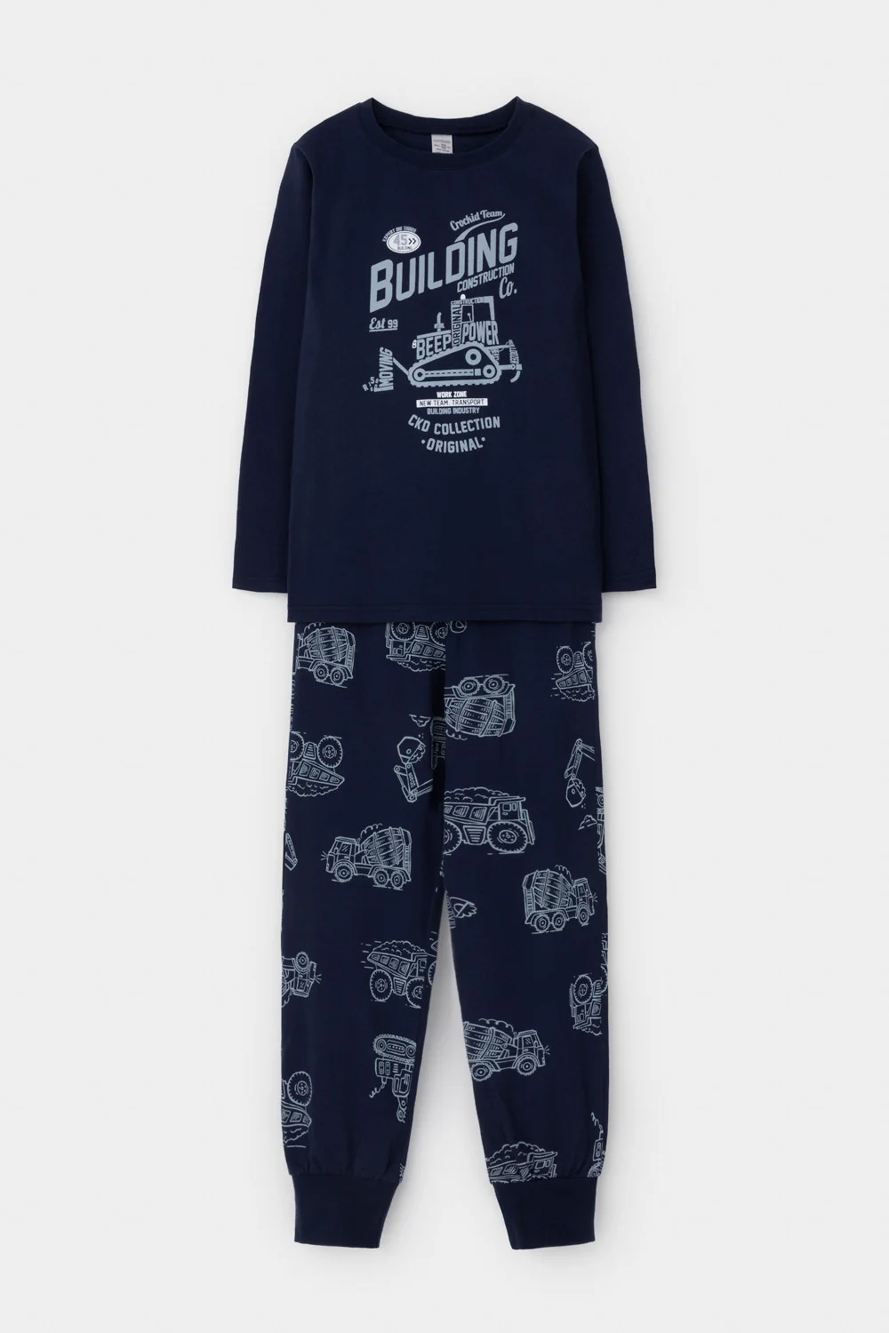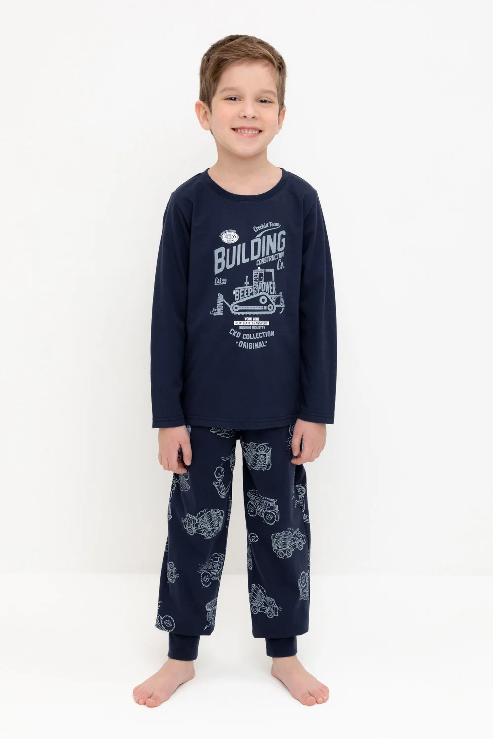 Пижама для мальчика из натурального хлопка. Джемпер с длинными втачными рукавами и брюки с эластичной резинкой в поясе. Мягкие манжеты по низу брюк сделаны из материала в рубчик. Оригинальная набивка и принт выполнены из стойких текстильных гипоаллергенных красителей. Изделие сохраняет цвет и форму после многократных стирок. Все трикотажные полотна производятся в соответствии с нормами швейцарского сертификата ЭкоТекс.