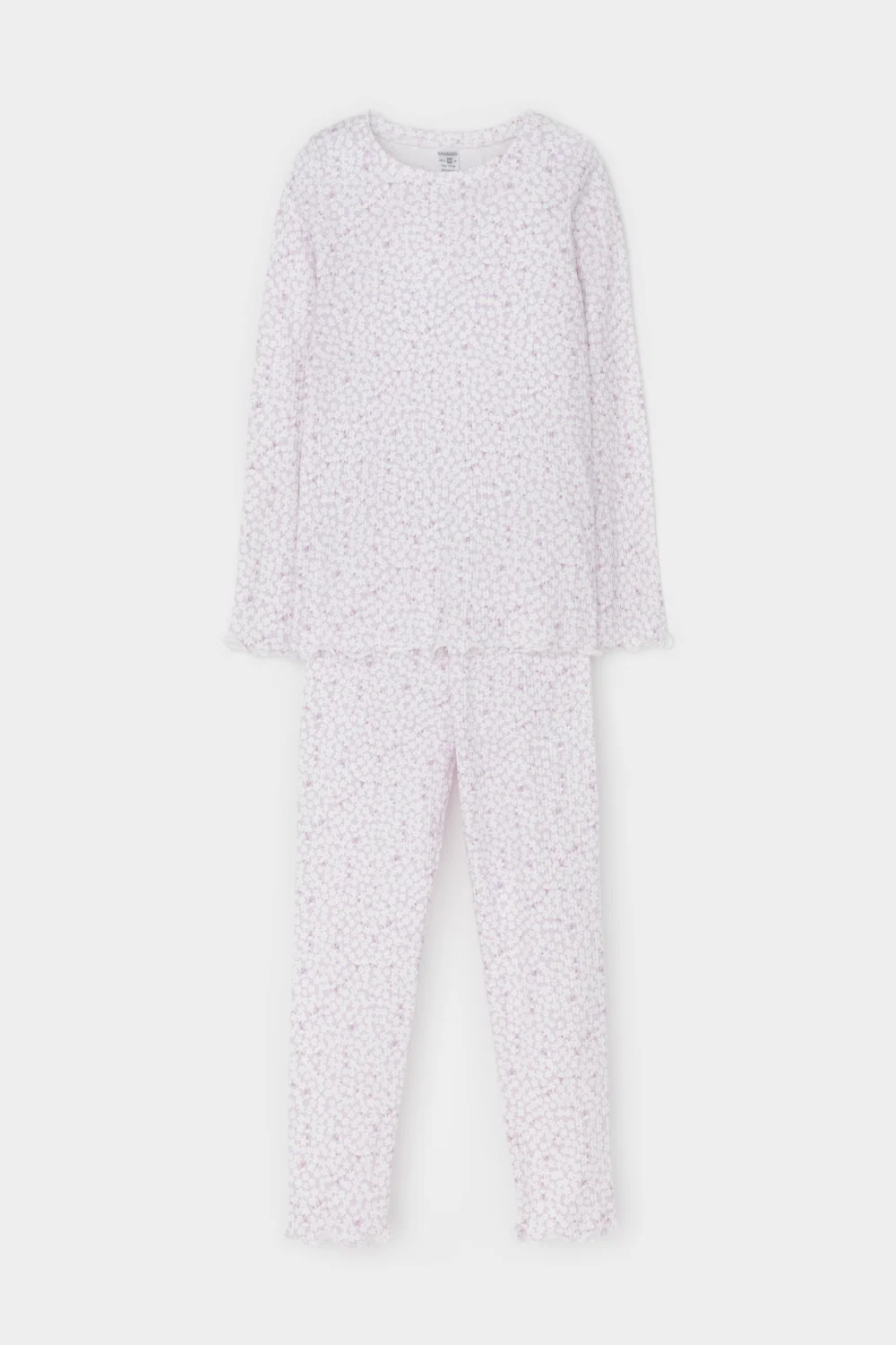 Трикотажная пижама в рубчик из натурального хлопка. Джемпер с длинными втачными рукавами и лосины с эластичной резинкой в поясе. Оригинальная набивка выполнена из стойких текстильных гипоаллергенных красителей. Изделие сохраняет цвет и форму после многократных стирок. Все трикотажные полотна производятся в соответсвии с нормами швейцарского сертификата ЭкоТекс.