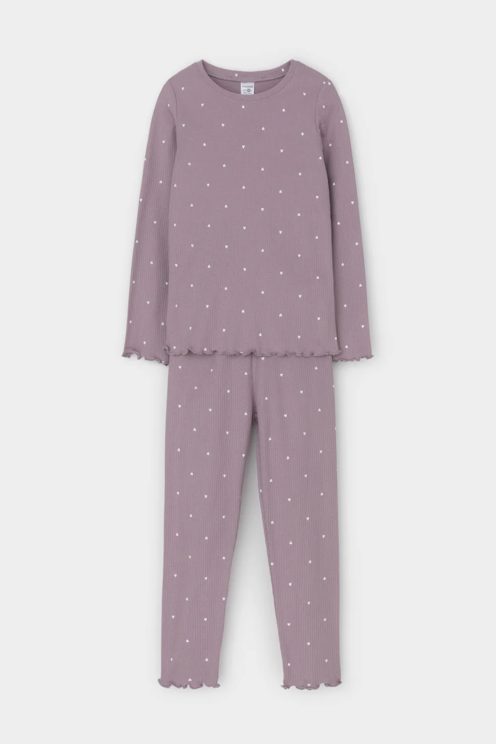 Трикотажная пижама в рубчик из натурального хлопка. Джемпер с длинными втачными рукавами и лосины с эластичной резинкой в поясе. Оригинальная набивка выполнена из стойких текстильных гипоаллергенных красителей. Изделие сохраняет цвет и форму после многократных стирок. Все трикотажные полотна производятся в соответствии с нормами швейцарского сертификата ЭкоТекс.