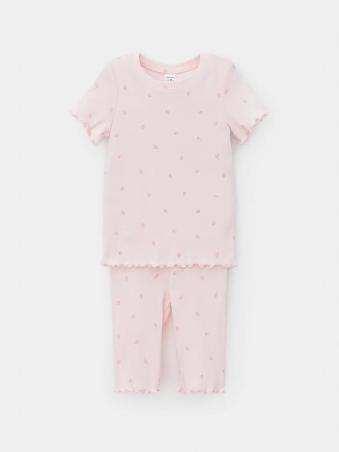 Трикотажная пижама в рубчик из натурального хлопка. Футболка с короткими втачными рукавами и шорты с эластичной резинкой в поясе. Оригинальная набивка выполнена из стойких текстильных гипоаллергенных красителей. Изделие сохраняет цвет и форму после многократных стирок. Все трикотажные полотна производятся в соответствии с нормами швейцарского сертификата ЭкоТекс.