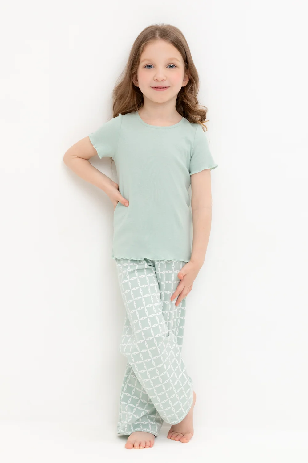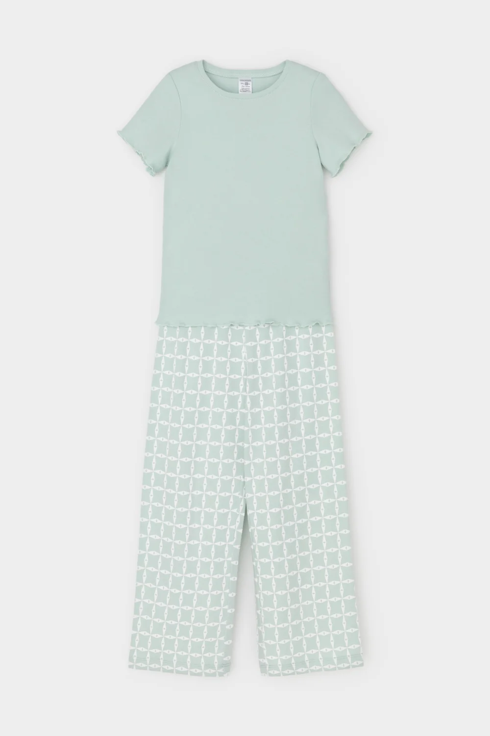 Трикотажная пижама из натурального хлопка. Футболка с короткими втачными рукавами изготовлена из эластичного трикотажа в рубчик. Брюки с эластичной резинкой в поясе выполнены из гладкого трикотажа супрем. Оригинальная набивка выполнена из стойких текстильных гипоаллергенных красителей. Изделие сохраняет цвет и форму после многократных стирок. Все трикотажные полотна производятся в соответсвии с нормами швейцарского сертификата ЭкоТекс.