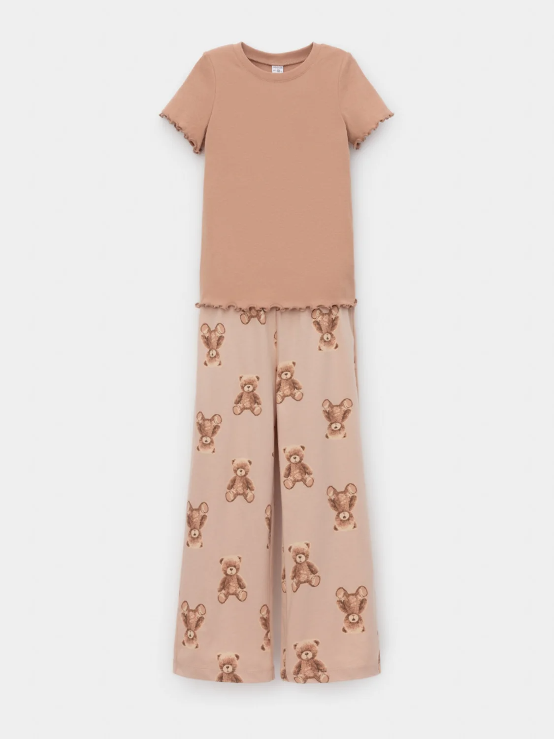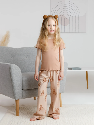 Трикотажная пижама из натурального хлопка. Футболка с короткими втачными рукавами изготовлена из эластичного трикотажа в рубчик. Брюки с эластичной резинкой в поясе выполнены из гладкого трикотажа супрем. Оригинальная набивка выполнена из стойких текстильных гипоаллергенных красителей. Изделие сохраняет цвет и форму после многократных стирок. Все трикотажные полотна производятся в соответствии с нормами швейцарского сертификата ЭкоТекс.