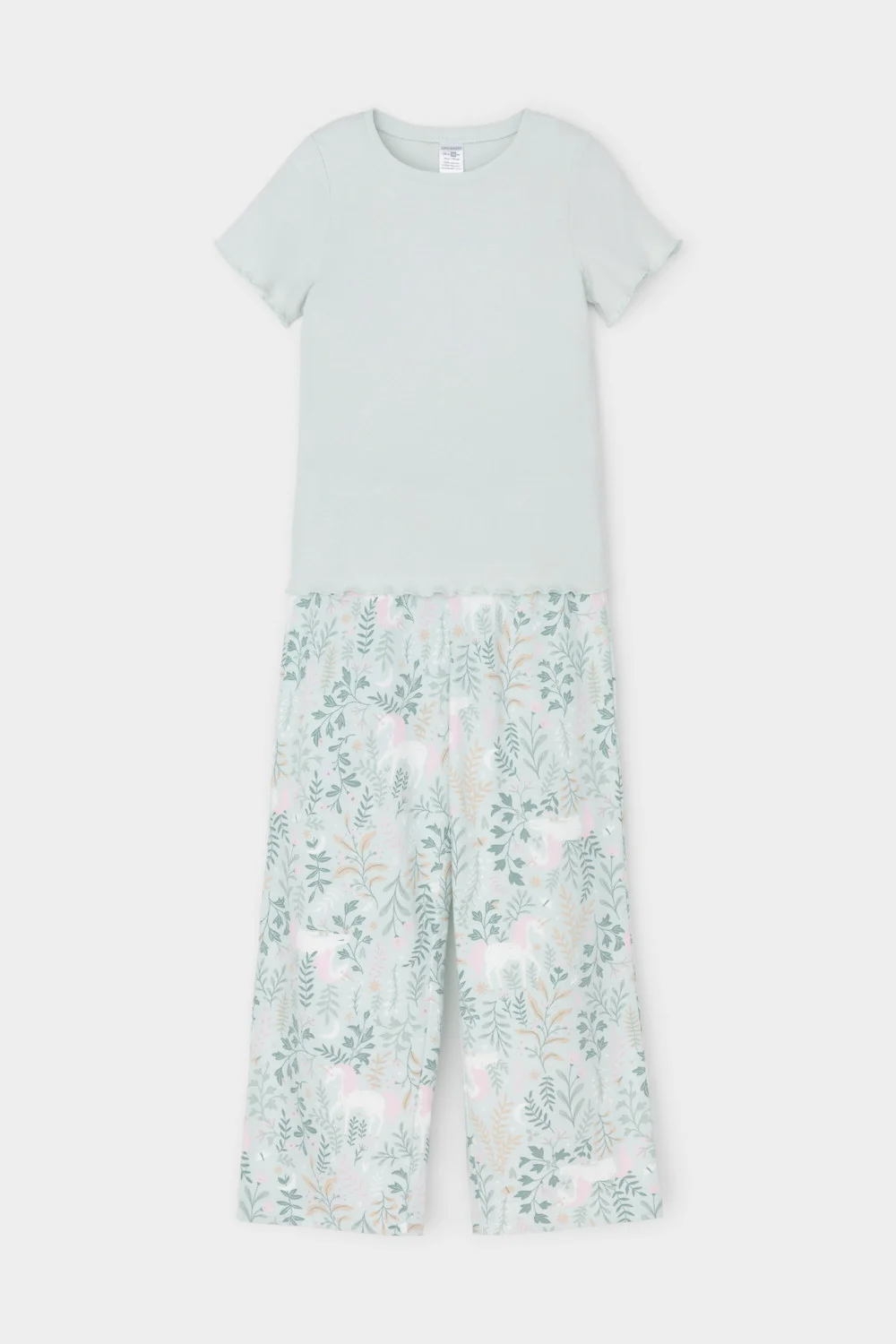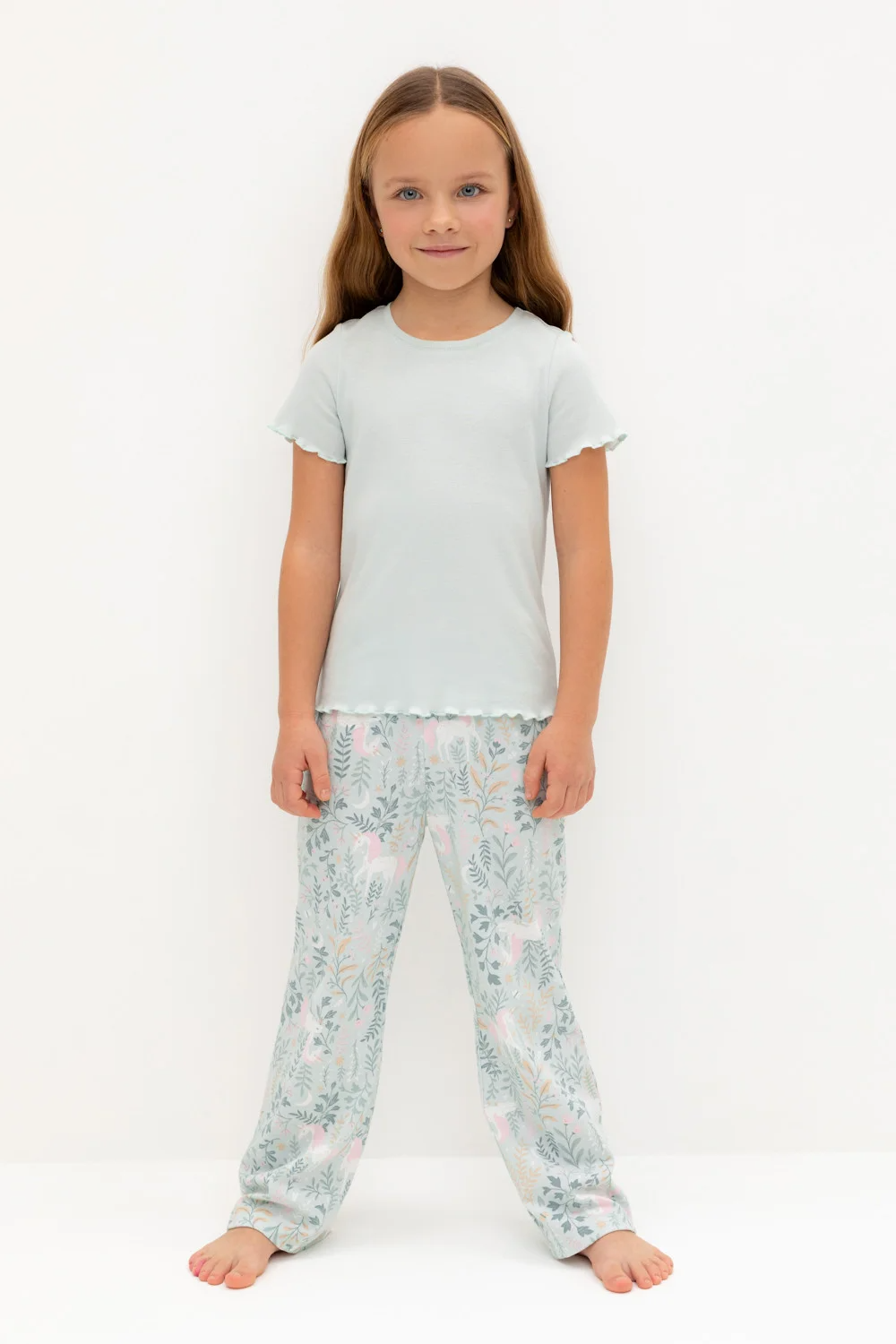 Трикотажная пижама из натурального хлопка. Футболка с короткими втачными рукавами изготовлена из эластичного трикотажа в рубчик. Брюки с эластичной резинкой в поясе выполнены из гладкого трикотажа супрем. Оригинальная набивка выполнена из стойких текстильных гипоаллергенных красителей. Изделие сохраняет цвет и форму после многократных стирок. Все трикотажные полотна производятся в соответсвии с нормами швейцарского сертификата ЭкоТекс.