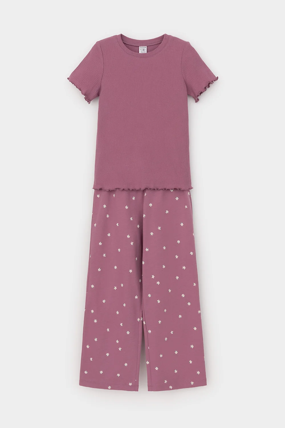 Трикотажная пижама из натурального хлопка. Футболка с короткими втачными рукавами изготовлена из эластичного трикотажа в рубчик. Брюки с эластичной резинкой в поясе выполнены из гладкого трикотажа супрем. Оригинальная набивка выполнена из стойких текстильных гипоаллергенных красителей. Изделие сохраняет цвет и форму после многократных стирок. Все трикотажные полотна производятся в соответсвии с нормами швейцарского сертификата ЭкоТекс.
