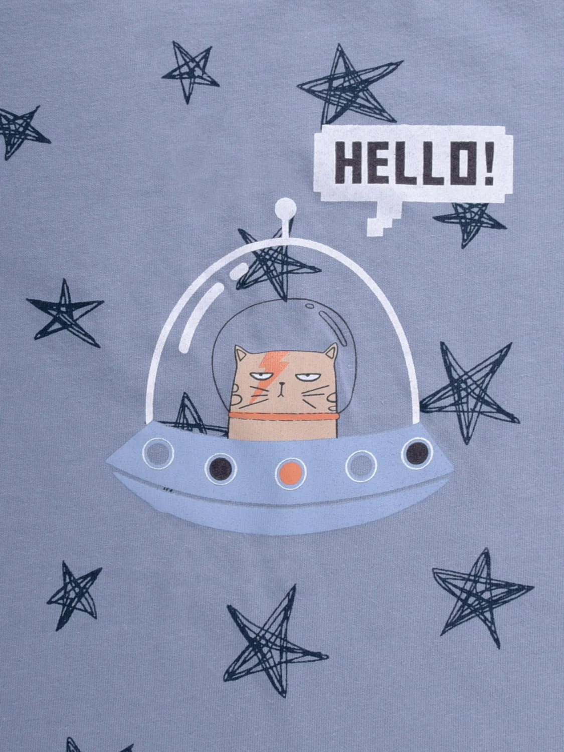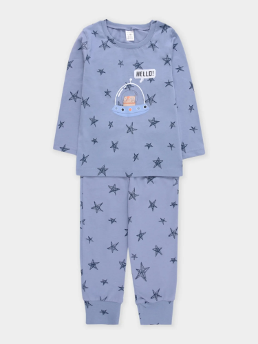 Пижама для мальчика из натурального хлопка. Джемпер с длинными втачными рукавами и брюки с эластичной резинкой в поясе. Мягкие манжеты по низу брюк сделаны из материала в рубчик. Оригинальная набивка и принт выполнены из стойких текстильных гипоаллергенных красителей. Изделие сохраняет цвет и форму после многократных стирок. Все трикотажные полотна производятся в соответствии с нормами швейцарского сертификата ЭкоТекс.