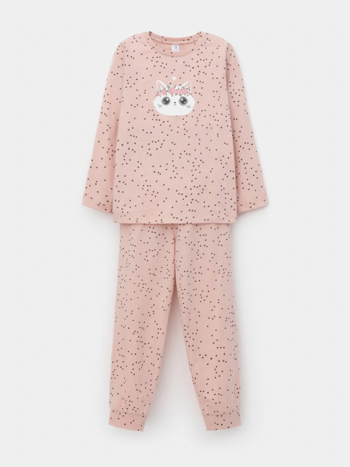 Пижама для девочки из натурального хлопка. Джемпер с длинными втачными рукавами и брюки с эластичной резинкой в поясе. Мягкие манжеты по низу брюк сделаны из материала в рубчик. Оригинальная набивка и принт выполнены из стойких текстильных гипоаллергенных красителей. Изделие сохраняет цвет и форму после многократных стирок. Все трикотажные полотна производятся в соответствии с нормами швейцарского сертификата ЭкоТекс.