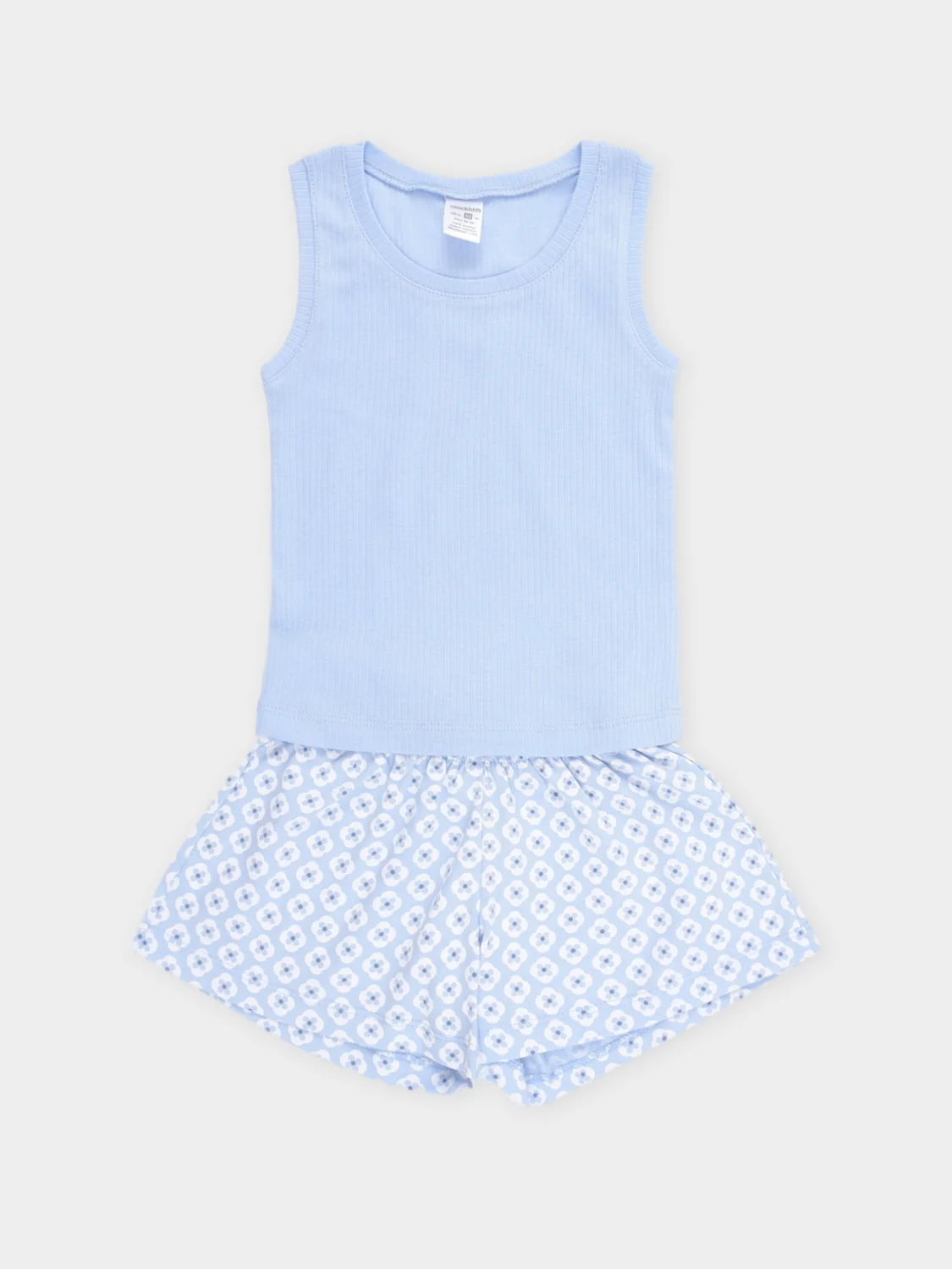 Трикотажная пижама для девочки с майкой и шортами. Майка изготовлена из эластичного трикотажа в рубчик. Шорты с эластичной резинкой в поясе выполнены из гладкого трикотажа супрем. Оригинальная набивка выполнена из стойких текстильных гипоаллергенных красителей. Изделие сохраняет цвет и форму после многократных стирок. Все трикотажные полотна производятся в соответсвии с нормами швейцарского сертификата ЭкоТекс.