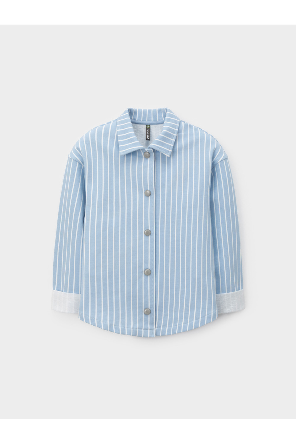 Свободная трикотажная рубашка для девочки из мягкого петельчатого футера. Застёгивается на кнопки. Модель с закруглённым низом и спущенным плечом. Рисунок в полоску выполнен из стойких текстильных гипоаллергенных красителей. Изделие сохраняет цвет и форму после многократных стирок. Все трикотажные полотна производятся в соответствии с нормами швейцарского сертификата ЭкоТекс.