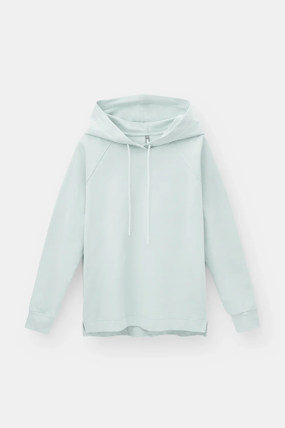 Толстовка однотонная с капюшоном и боковыми карманами из петельчатого футера. Рукава реглан, манжеты из основного полотна. Свободный силуэт. Все трикотажные изделия производятся в соответствии с нормами Швейцарского сертификата ЭкоТекс.