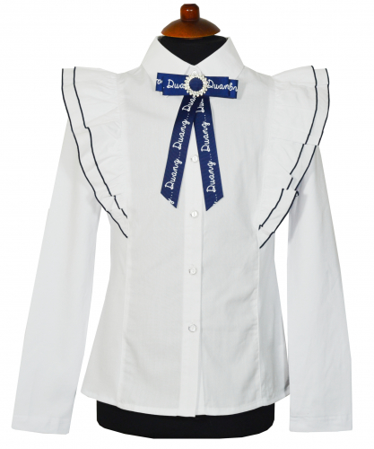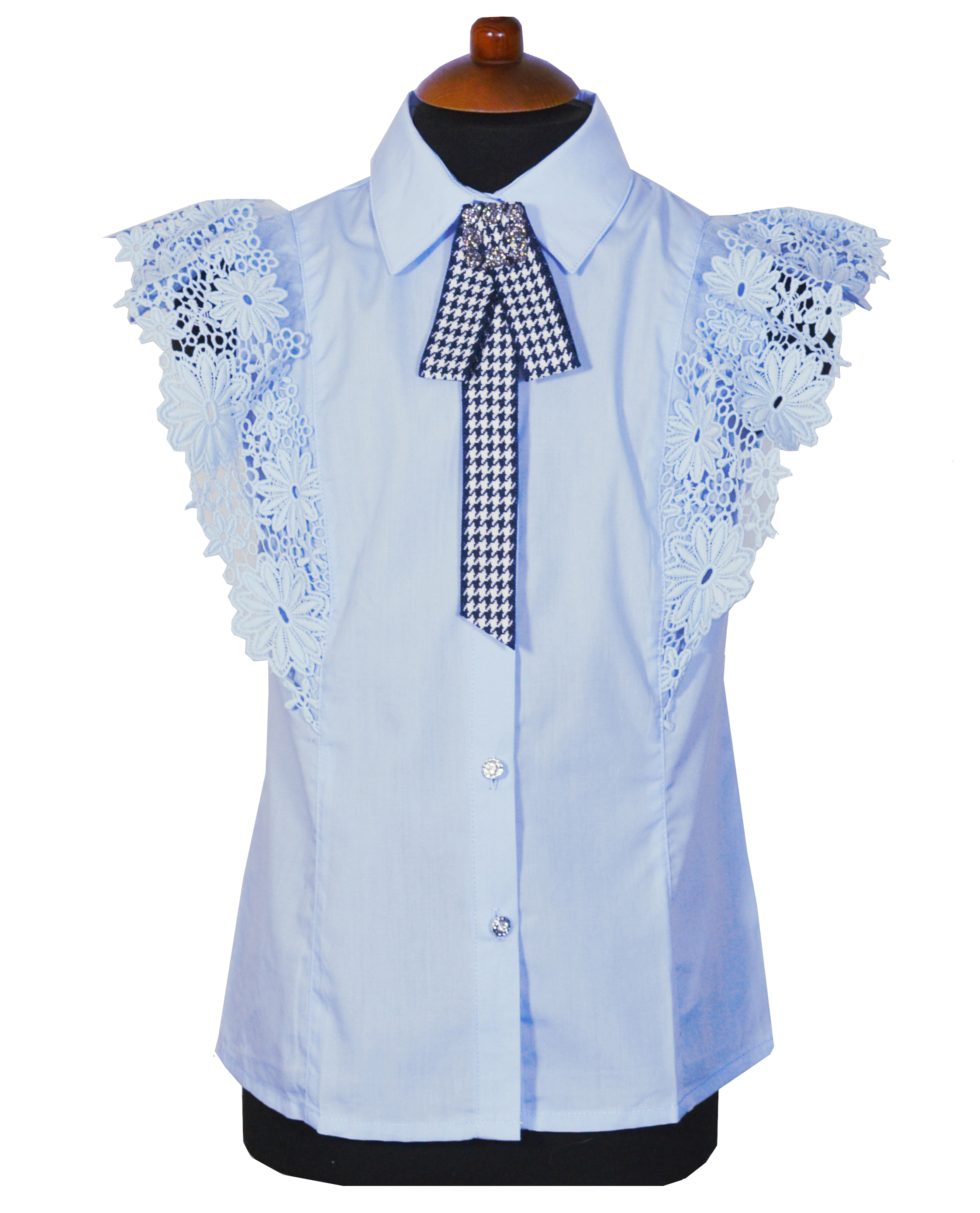 Блузка для девочки из хлопковой рубашечной ткани. Отложной воротник. Застежка на пуговицы. Дополнена блузка кружевными вставками. Брошь входит в комплект. Спинка без особенностей.