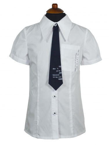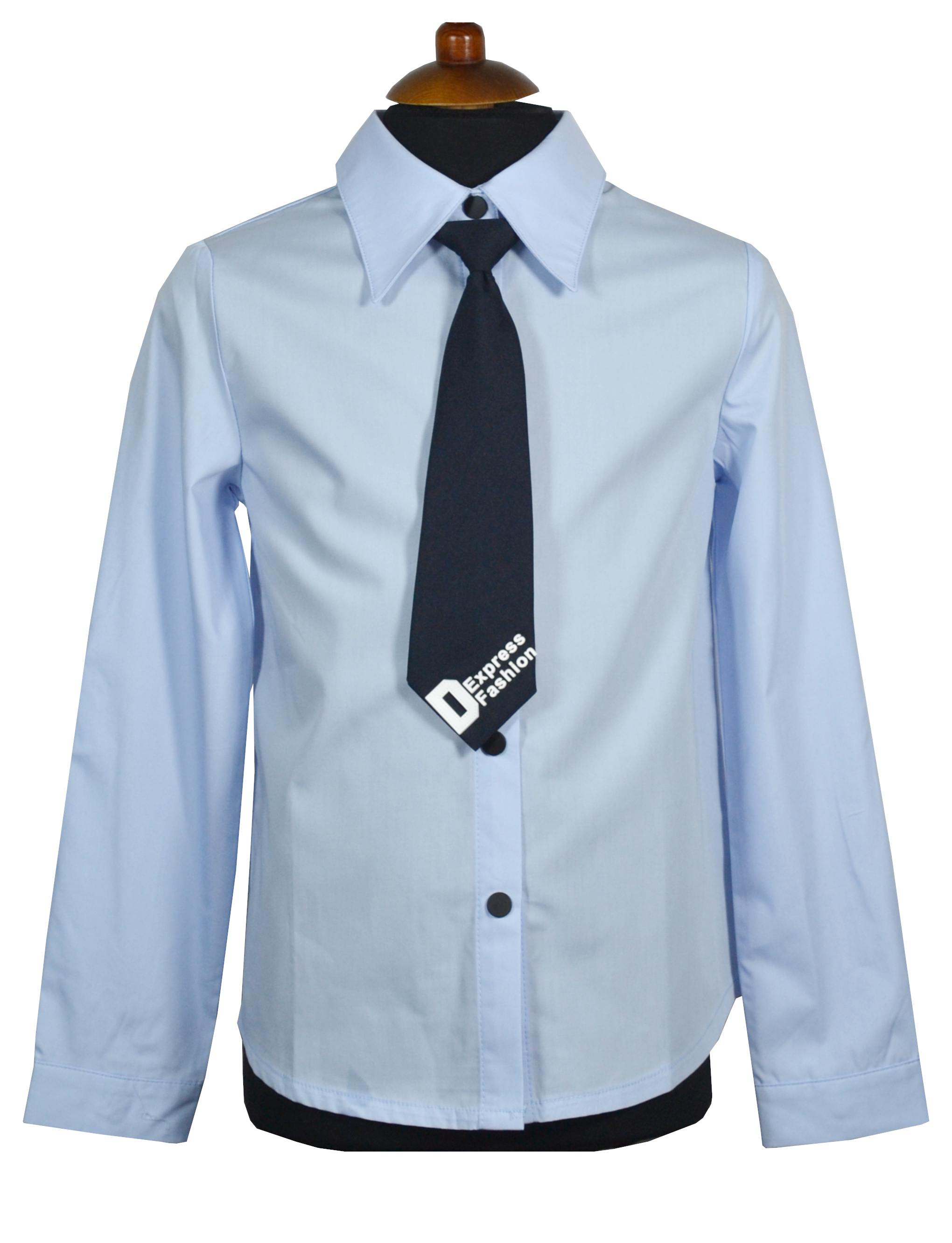 Блузка с длинным рукавом из хлопковой ткани прямого кроя. Отложной воротник. Застежка на кнопки.  Галстук темно-синего цвета с надписями на резинке входит в комплект. По спинке кокетка и защип, за счет которого создается свободный крой.