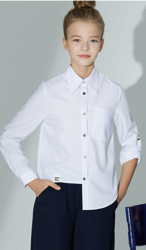 Блузка с длинным рукавом из вискозной ткани свободного кроя. Отложной воротник. Застежка на пуговицы. Накладной карман. Рукав можно подвернуть. По спинке кокетка как у рубашек и защип за счет которого создается свободный крой. Асимметричная длина. По спинке нет асимметрии.